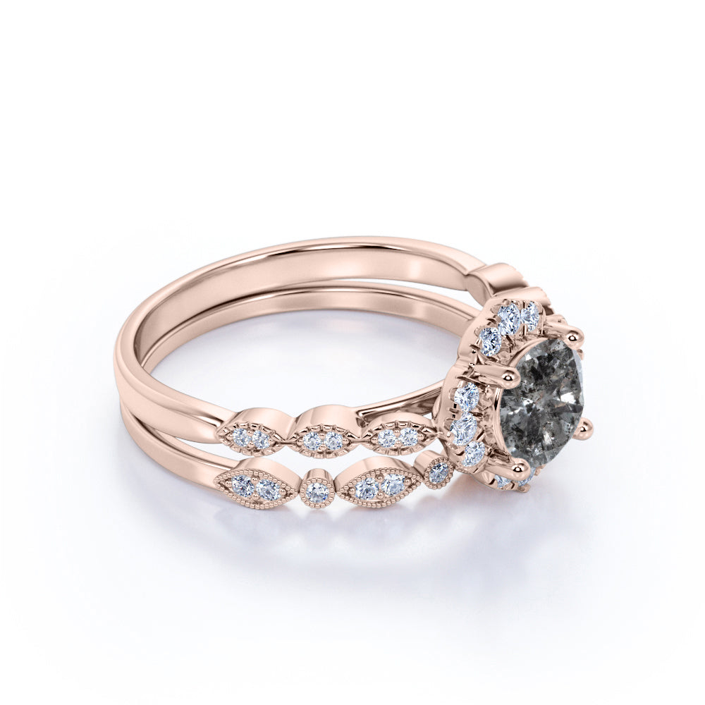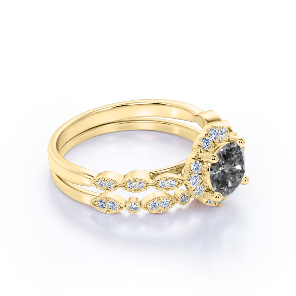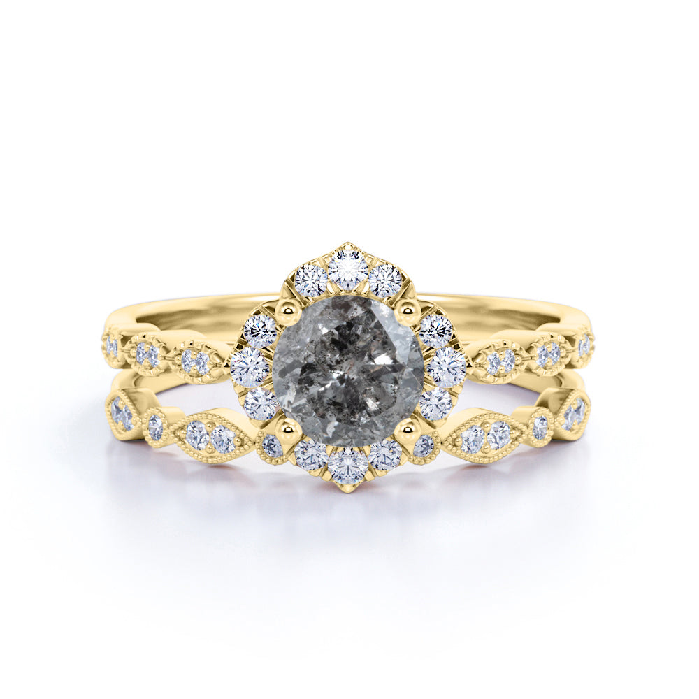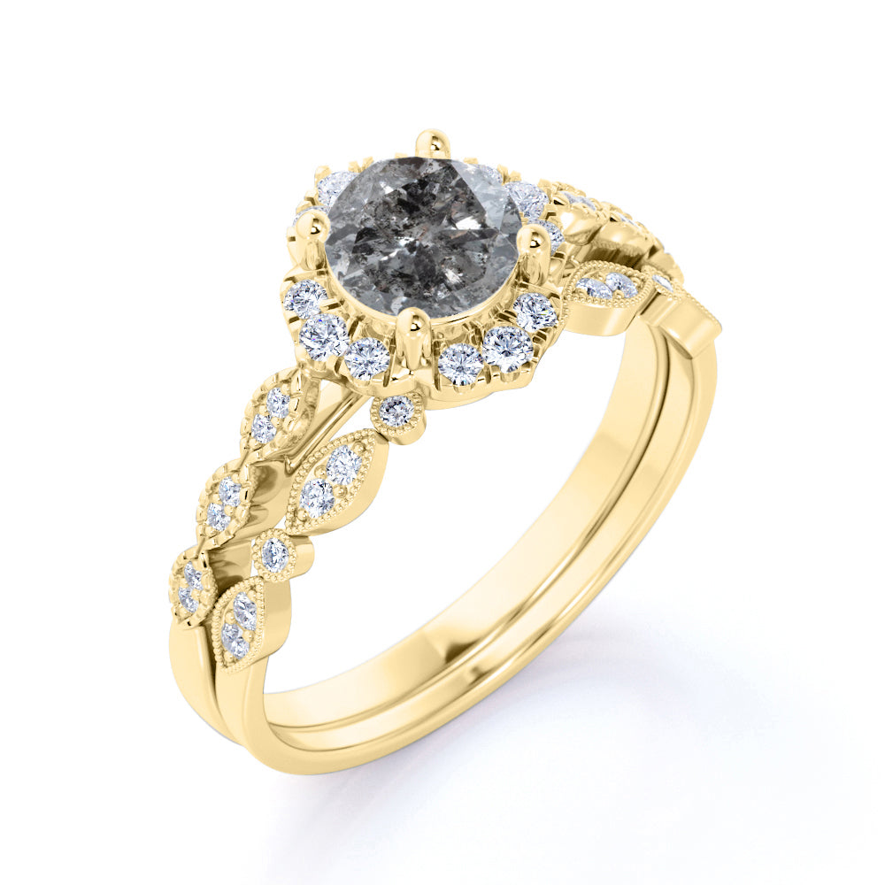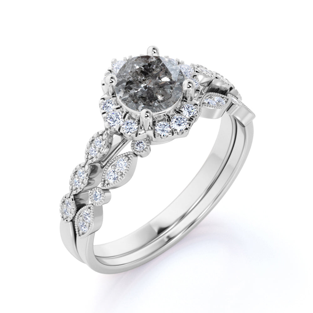 IMPORTANT NOTE: Since each Salt and Pepper Diamonds is one of a kind, the actual color of it may vary from the one that is pictured above. With its quirky inclusions, this Flower Halo 1 Carat Round Cut Dark Grey Salt and Pepper Diamond Art Deco Wedding Ring Sets will surely make you stand out from others. This nature-inspired ring features 0.70 carat round cut natural Salt and Pepper Diamond and 0.30 carat real side Diamond for gold ring and Moissanite for silver ring. This intricate bridal set rings can be customized to either 10k, 14K and Gold over Silver and either Black Gold, Rose Gold, White Gold or Yellow Gold. Also, as your satisfaction is our most priority, we will do our best to have your handmade jewelry be carefully and beautifully crafted by our expert jewelers. The order also comes with a 30-day full refund policy. Due to its unique appearance, this ring will be a distinctive gift for all special occasions. With its unique appearance, you can be sure that no any other rings will look exactly alike. Ornament and distinguish your love story with the neat distribution of black and white inclusions of Salt and Pepper Diamond. It provides an ideal way to stand out from crowd with a gorgeous and distinctive ring. Being considered a very eccentric gemstone, this ring will create a timeless and fabulous engagement ring. With its especial color ranging from silky grays to stormy almost blacks, no two Salt and Pepper Diamond rings are alike. Sparkle your finger with this ring which is perfect for any occasion and everyday wear. Diversity of Salt and Pepper Diamond provides additional character to your traditional engagement ring. It is the perfect match for those who are looking for a remarkable gemstone rings as Salt and Pepper embodies their own unique combination of color and uplifting meaning.