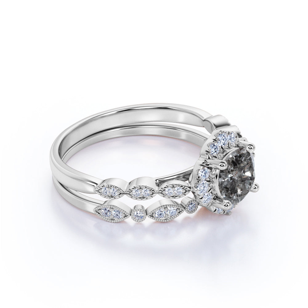 1 Ct Round Salt and Pepper Diamond Flower Wedding Ring Set