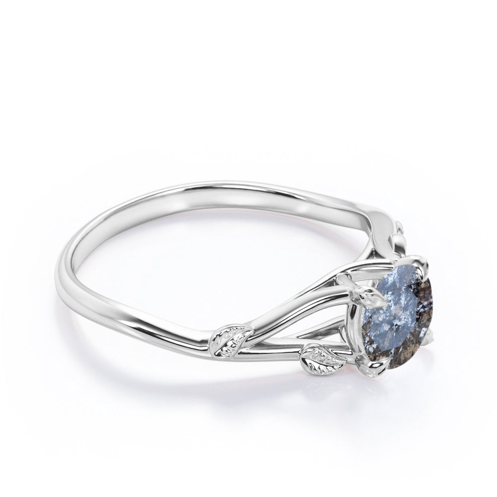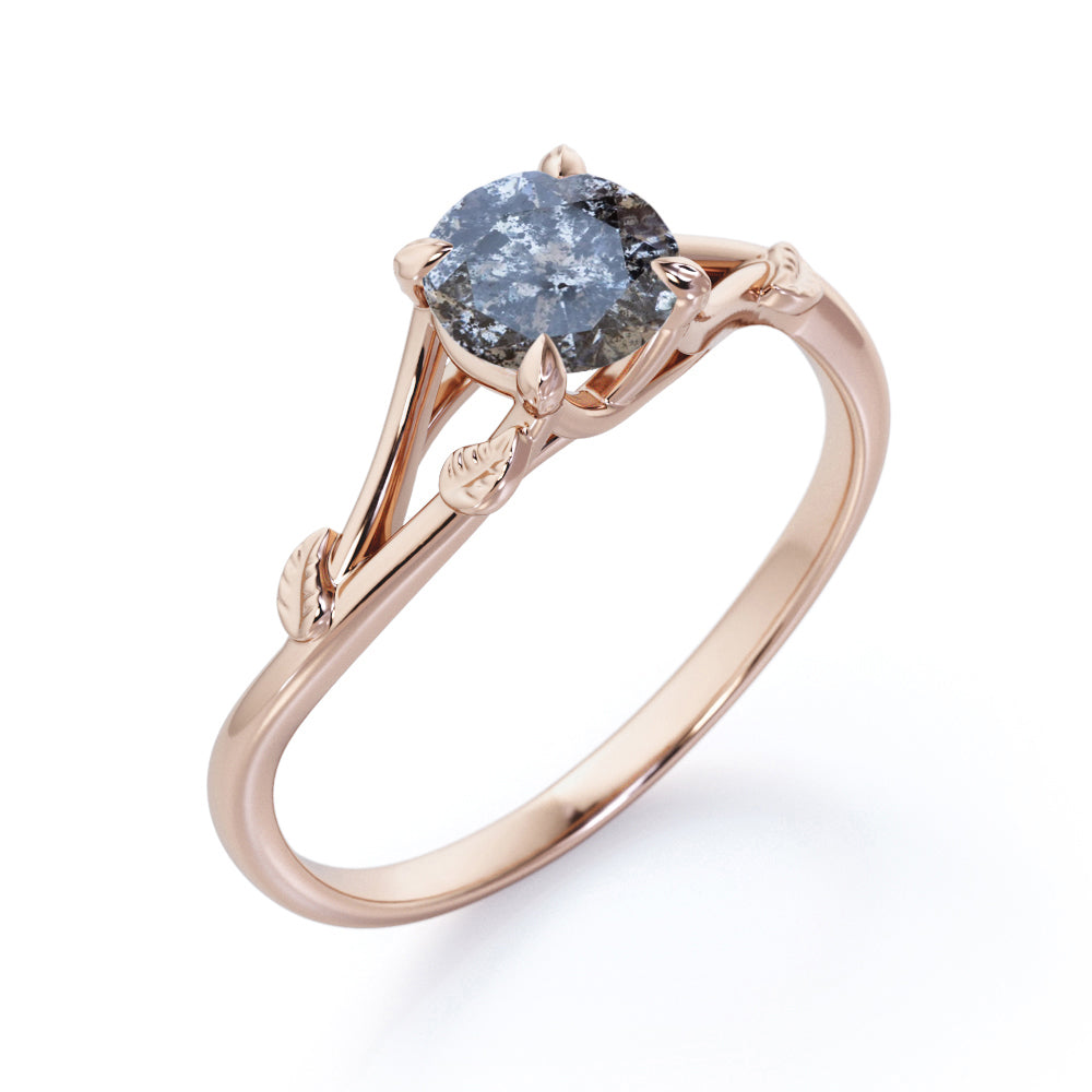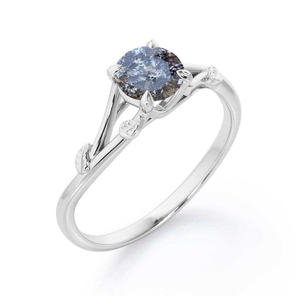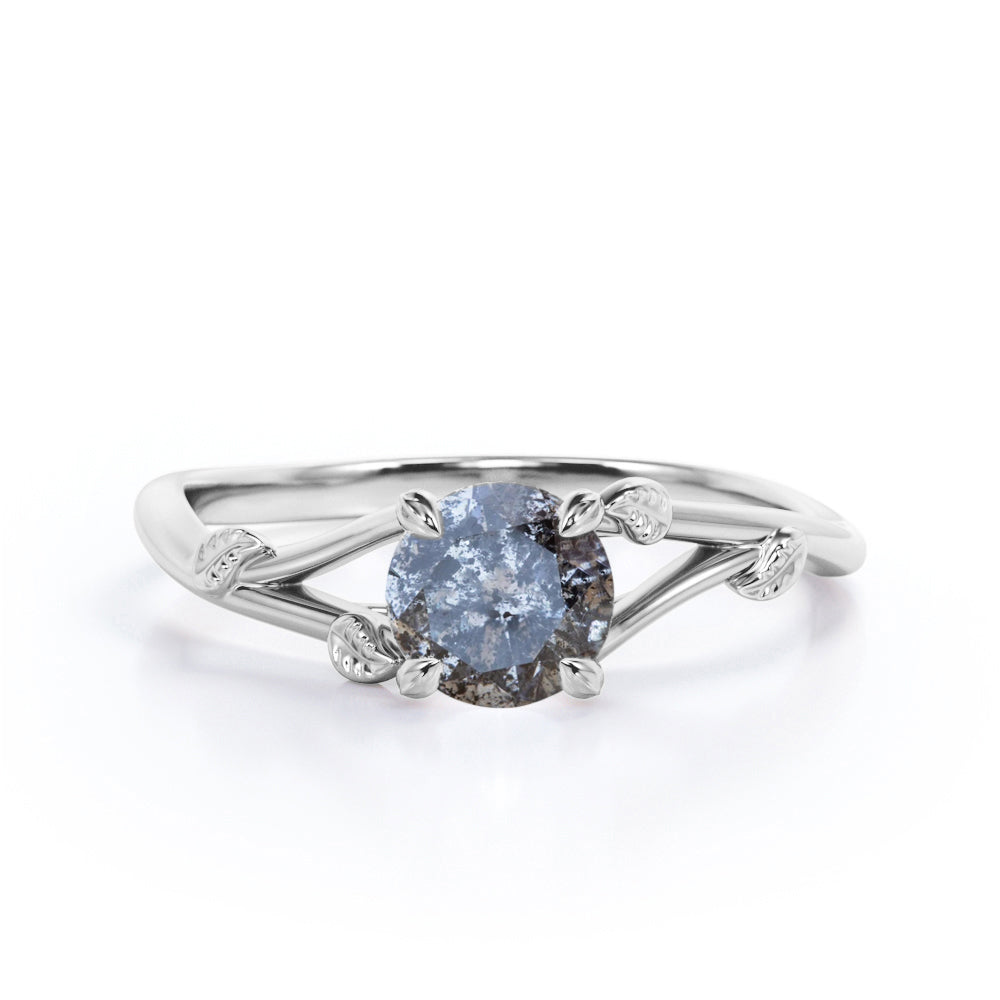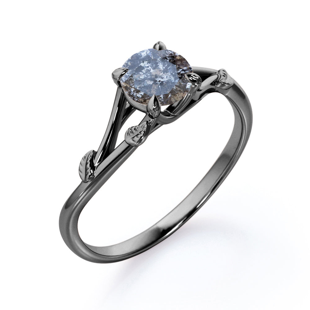 Nature Inspired 0.33 Carat Round Cut Genuine Salt and Pepper Diamond Split Shank Engagement Ring In White Gold. If you want an affordable diamond in your hands then salt and pepper diamond ring is the best option to go for. The split band on this nature inspired engagement ring features subtle leafy detailing giving this classic solitaire a modern revamp. With a round brilliant solitaire at the center, it doesn't get more elegant than this. This split shank engagement ring features 0.33 carat of genuine salt and pepper diamond as the center stone. Subtle yet classy, this leaf vine art salt and pepper diamond ring is perfect for the minimalist bride who lean towards modern elegance. Handmade with great devotion, this nature inspired 0.33 carat round cut genuine salt and pepper diamond split shank engagement ring can also be customized to 18k Gold plating over silver, 10k Gold, 14k Gold or 18k Gold as you prefer.
