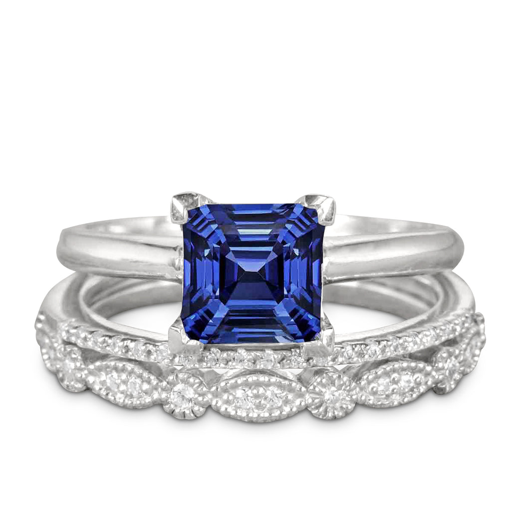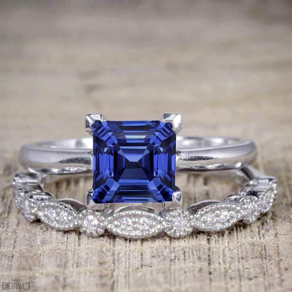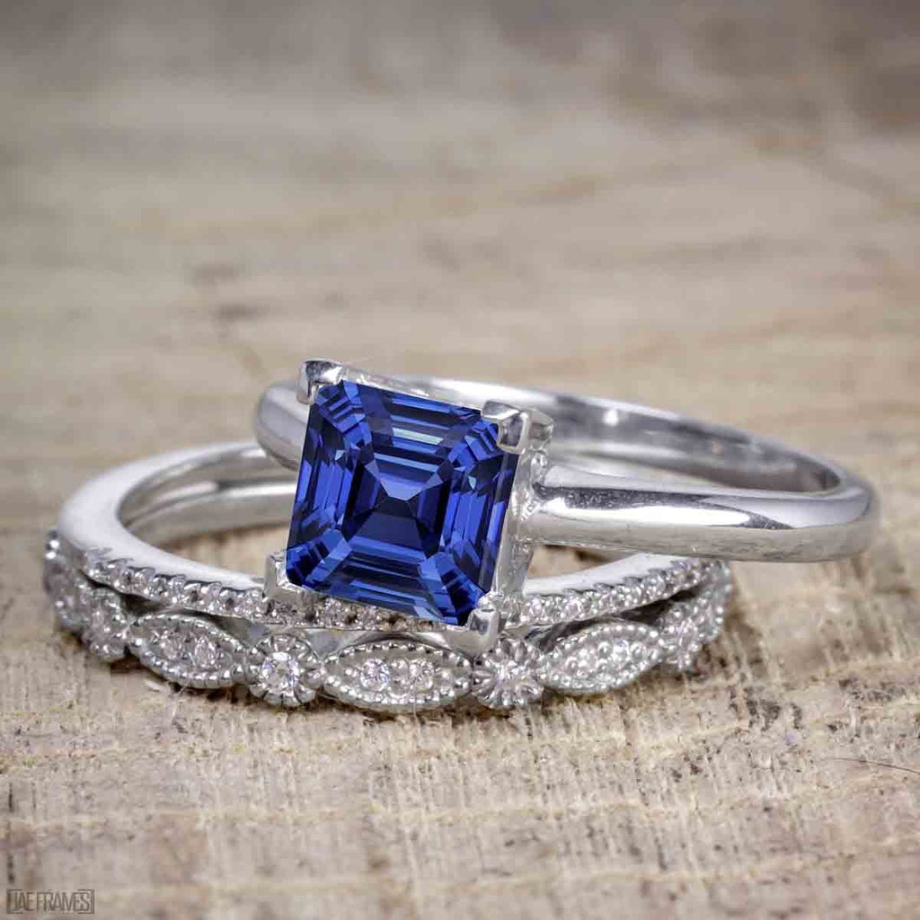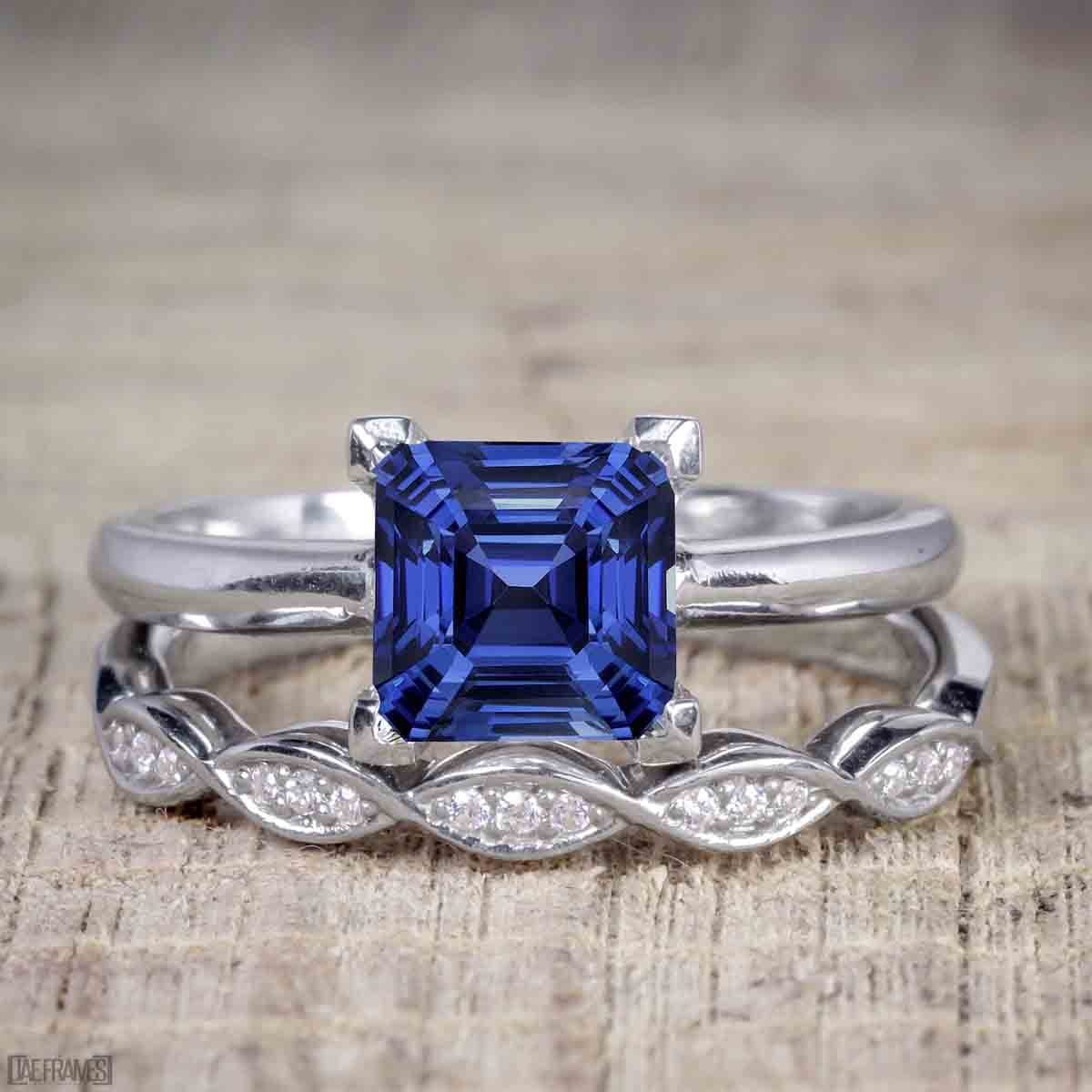 Art Deco 1.5 Carat Princess Cut Real Sapphire and Moissanite Wedding Trio Ring Set with Engagement Ring and 2 Wedding Bands in 18k Gold Over Silver