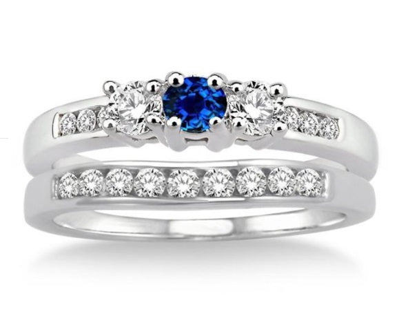 Stunning 2 Carat Round Cut Real Sapphire and Moissanite Bridal Wedding Ring Set with Engagement Ring and Wedding Band in 18k Gold Over Silver