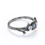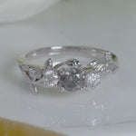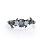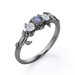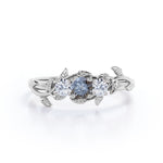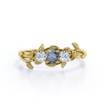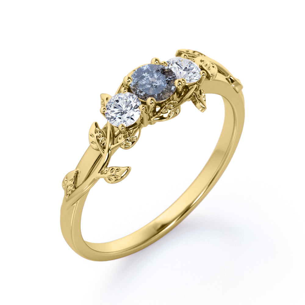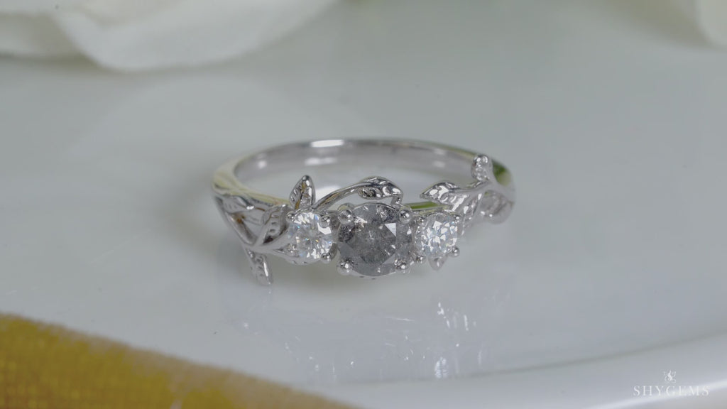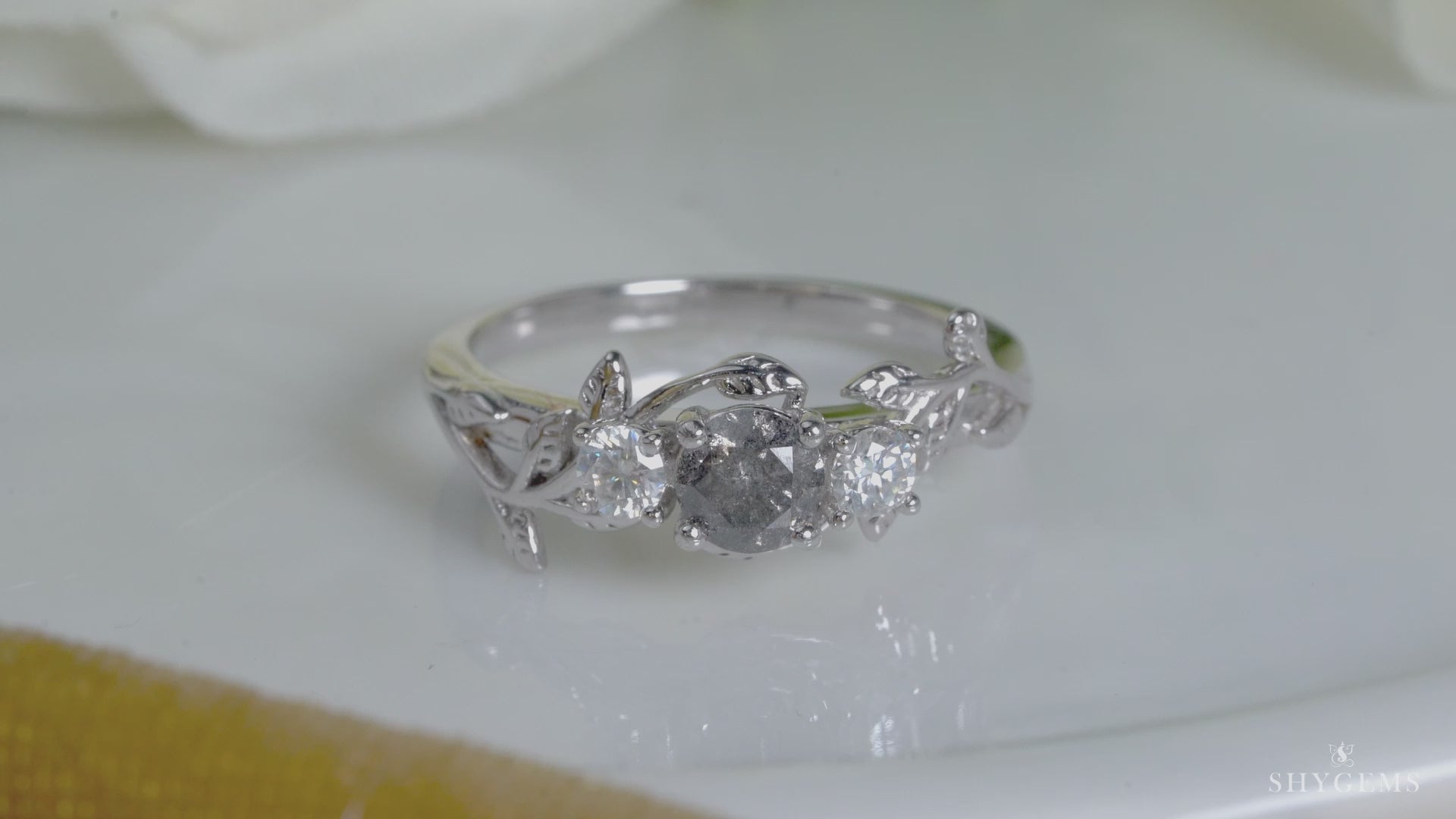 Floral Design 0.50 Carat Round Cut Natural Salt and Pepper Diamond Three Stone Engagement Ring In White Gold. Absolutely perfect choice for couples who want their engagement story to be filled with meaning that is unique to their relationship. The three stones in the ring comes with a deeper meaning, traditionally symbolizing friendship, love, and fidelity. The brilliant round cut three stones in this divine ring also represents a couple's past, present and future. So what better way to profess your love and commitment to each other than this meaningful yet fashionable ring. The nature inspired ring band is intricately carved and crafted into delicate leaf and vines that run flawlessly along the fingers. Handmade with sincere love and attention by our craftsmen, this 0.50 carat floral design 0.50 carat round cut natural salt and pepper diamond three stone engagement ring in white gold can also be customized to 18k Gold plating over silver, 10k Gold or 14k Gold as per your preference.