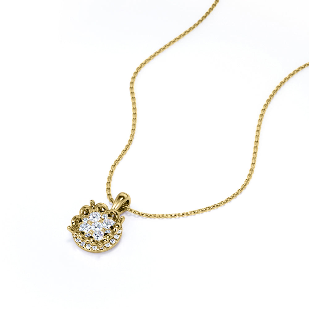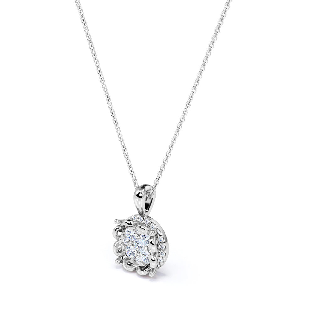 The picture might not justify the beauty of this Stylish Blooming flower 0.5 carat Round Moissanite/ Diamond Pendant with 18k Rose Gold Over Silver but it will not disappoint you. In the middle, features various sizes of round Moissanite that are secured in round and triangle prongs, forming into a glimmering pollen of the flower. It is encases by half scalloped frame that looks like shining sleek petals while hidden halo is placed right underneath the accent to add more sparkle to the pendant. The pendant bail is commonly plain and connect the pendant to the chain. This lovely jewelry can be made in 18k gold over silver with the color of white gold, rose gold, yellow gold and black gold.