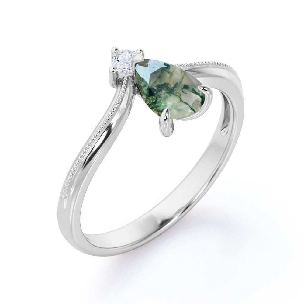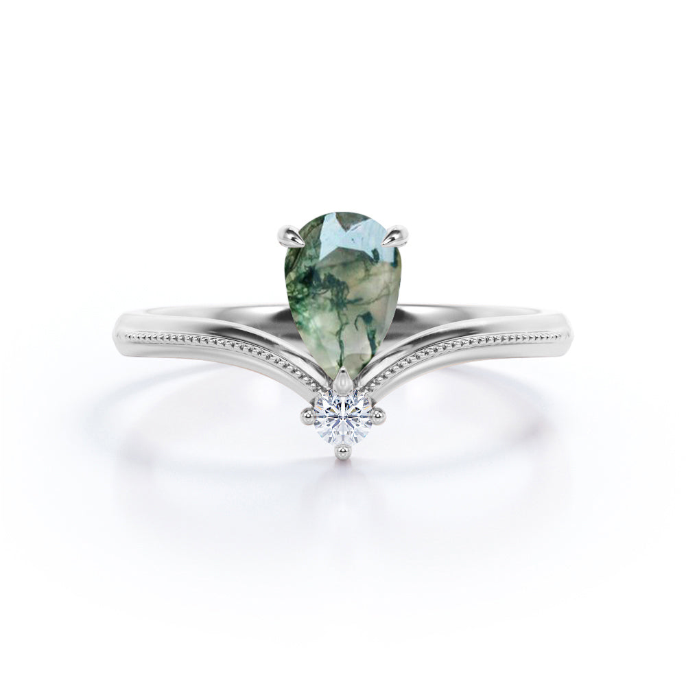 Chevron 0.8 carat Pear Moss Agate and Moissanite Milgrain Engagement Ring in White Gold is an exceptional gift to all women. The engagement ring boasts a 0.5 carat pear shape Moss agate and touched with 0.1 carat round Moissanite. The promise ring is very simple yet unique and elegant. Authentic Moss green agate is placed on the chevron band that garnished with bead line by half of the ring and supported by 3 claw prongs. V-shape band locks the pointy part of tear drop Moss agate smoothly. The ring comes at a very reasonable price and it can be customized to your choice of 18k gold over silver, 10k gold, 14k gold and 18k gold with the color options of white gold, rose gold, yellow gold and black gold.