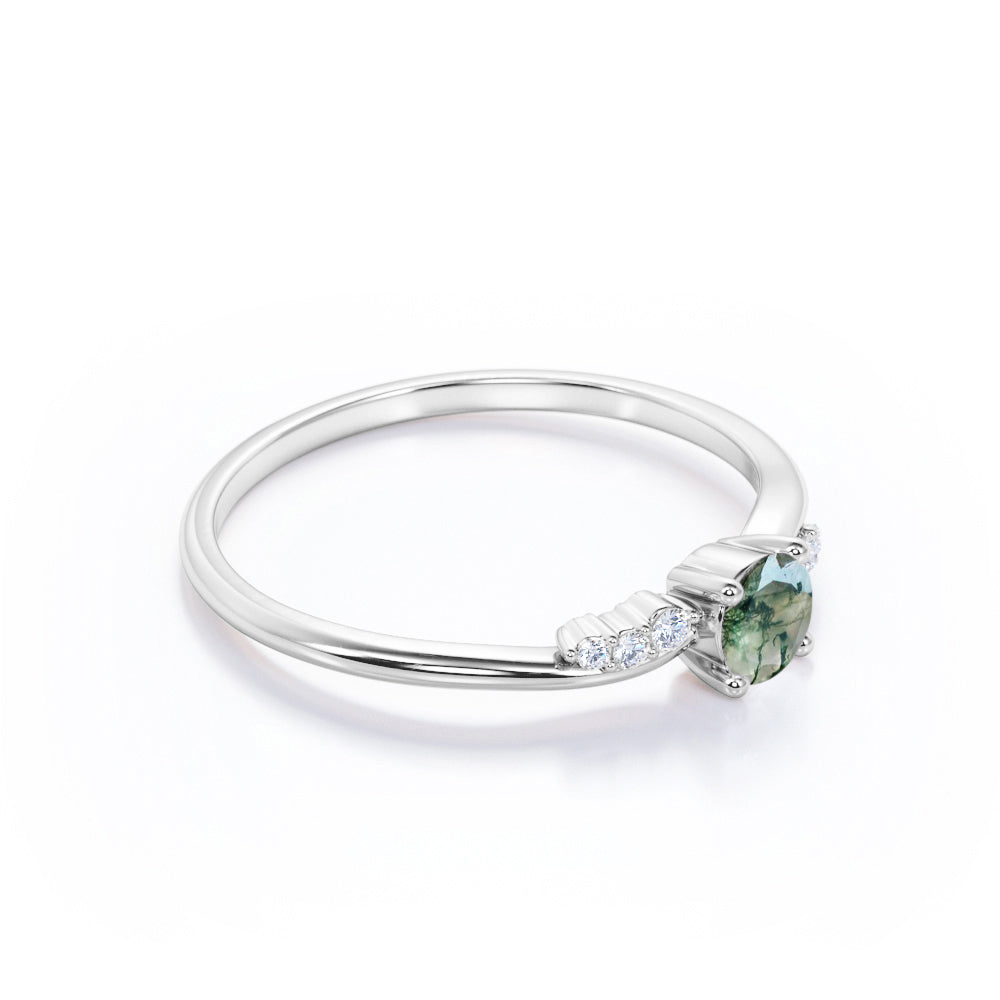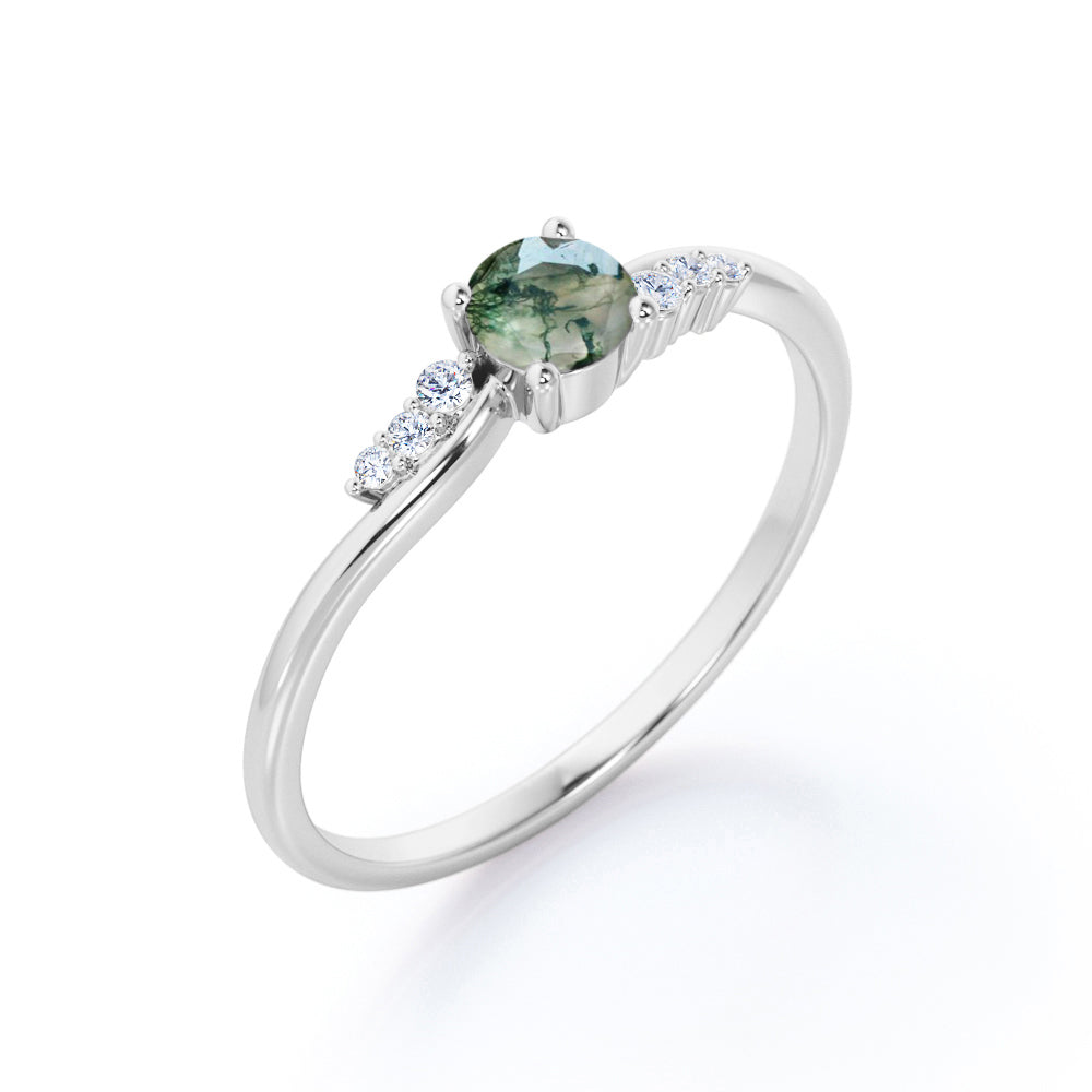 Celebrate the special occasion with this Classic 7 Stone Ring For Her - 0.55 carat Round Moss Agate and Moissanite Promise Ring in White Gold. The ring comes with a very simple design but it will look cute on her finger. Striking 0.5 carat round green agate stone is located in the center and flanked by tapered round Moissanite. The shank is curved like a small water wave and it will make you feel more relaxing; the curves on the left and right of the center stone are bent in different directions as well as the dwindled round Moissanite stones that are placed on the upper and lower part of the band. All of our green moss agate rings are authentic and cost effective. Every ring can be made in 18k gold over silver, 10k gold or 14k gold with the color options of white gold, rose gold, yellow gold and black gold.