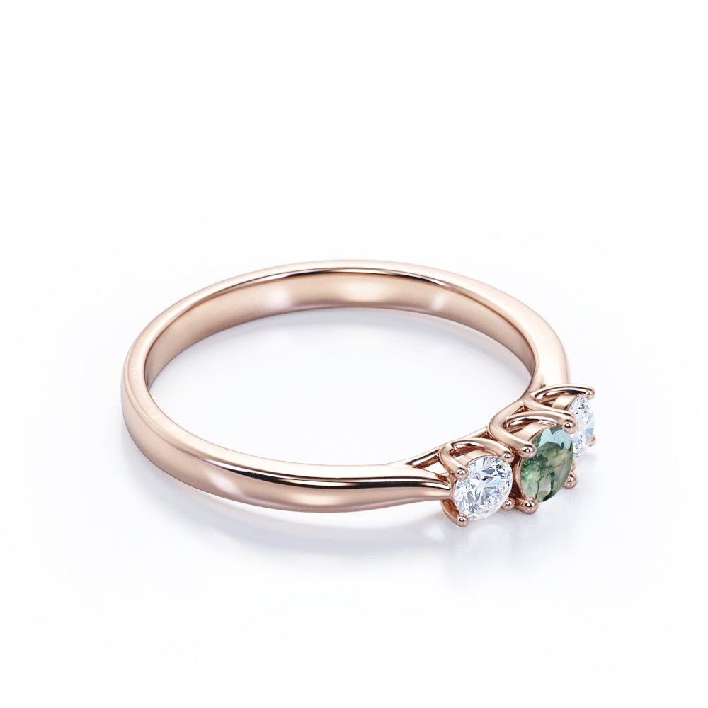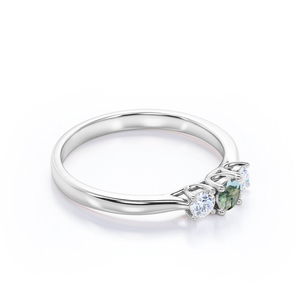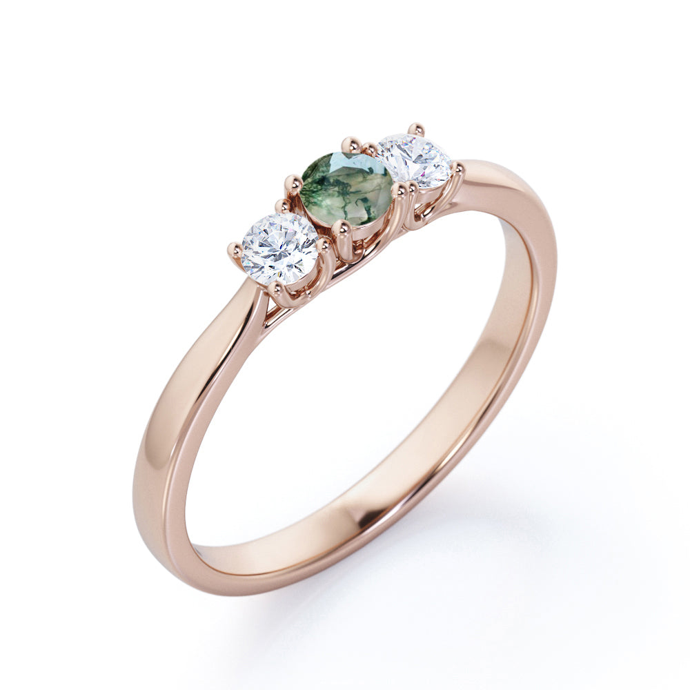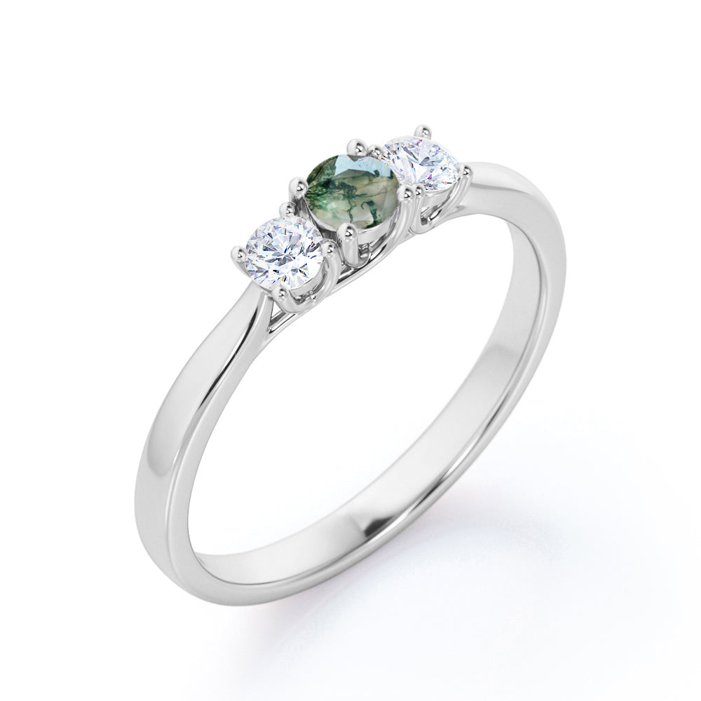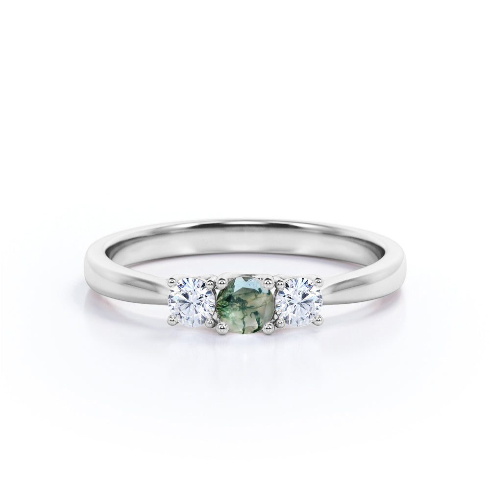 Classic trio ring - 1 carat Round Moss Agate and Moissanite Promise Ring in White Gold