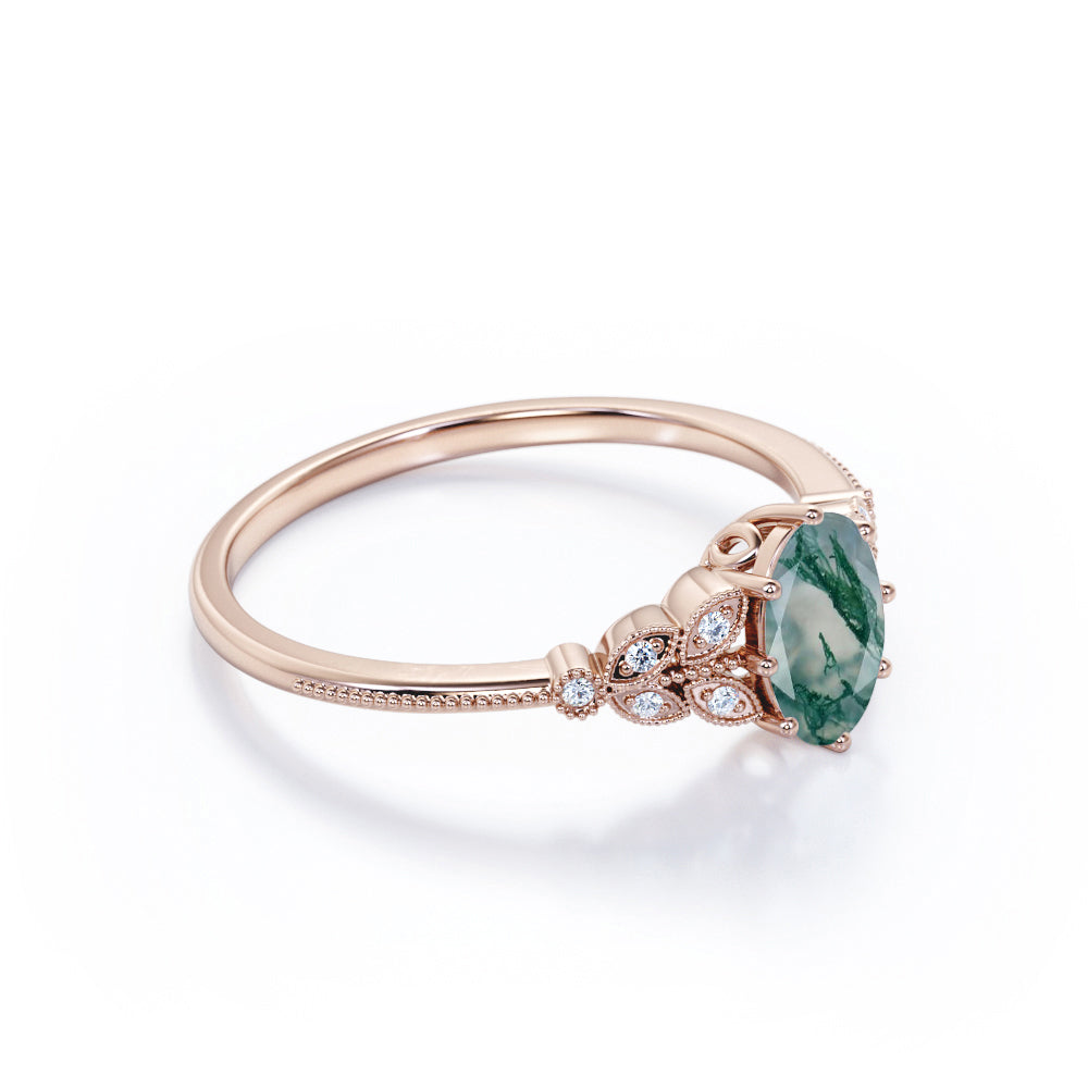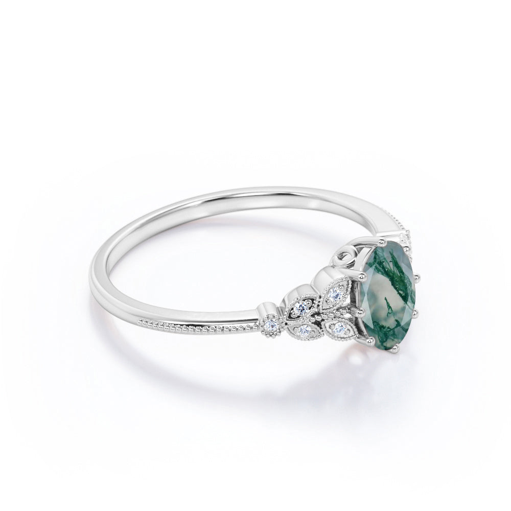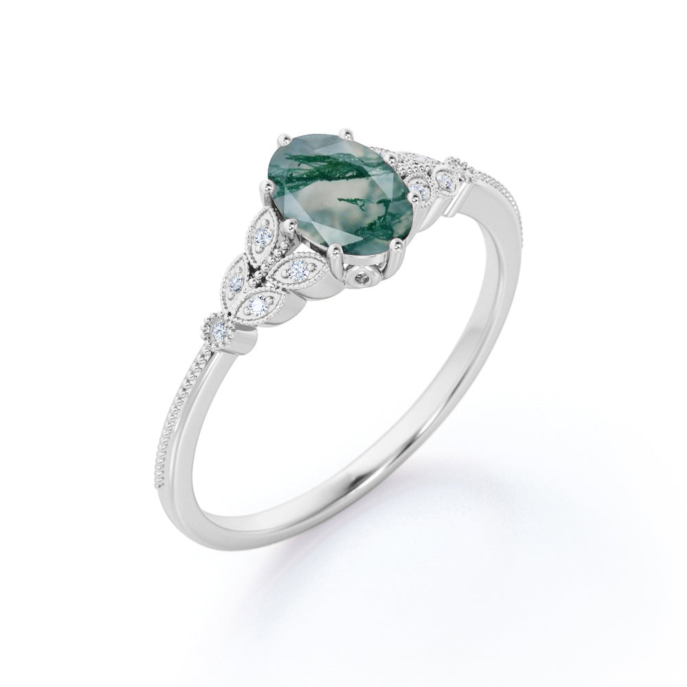 Paint your love story with this Floral Leaf Style 1.25 Carat Oval Cut Solid Transparent Druzy Moss Green Agate and Diamond Antique Milgrain Engagement Ring. This nature-inspired milky white agate ring features 1 carat oval cut natural moss green agate and .25 carat real genuine side diamond for gold ring and moissanite for silver ring. This vintage engagement ring can be customized to either 10k, 14K and Gold over Silver and either Black Gold, Rose Gold, White Gold or Yellow Gold. Also, as your satisfaction is our most priority, we will do our best to have your handmade jewelry be carefully and beautifully crafted by our expert jewelers. The order also comes with a 30-day full refund policy. This green colored minerals with banded inclusions ring will surely be a perfect gift for your special someone. It is believed to bring abundance in wealth and improve self-esteem. Encourage trust and hope with this real green Agate ring that shows a variety of white with green inclusions that resembles moss. The unique green color in its patterns will surely complement every style of its wearer. This moss green Agate ring is a very perfect alternative to those traditional ring. It can be customized as per your satisfaction and available in both silver and gold metal. With its moss-like inclusions, this ring will make you shine and stand out from others. Crowned as a stone of power and wealth, this green Agate with mossy inclusions ring will attract abundance in all forms. Those who has a penchant for vintage and flawless ring would completely fall in love with this ring. It is the perfect match for those who are looking for a remarkable gemstone rings as moss green Agate embodies their own unique intriguing patterns and uplifting meaning.