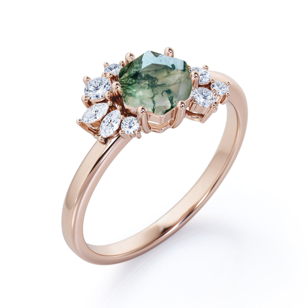 Clustered 0.6 Carat Hexagon Moss Agate Engagement Ring