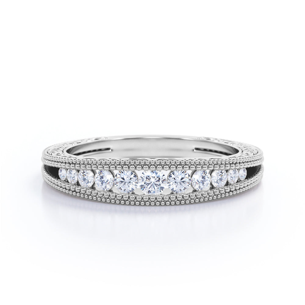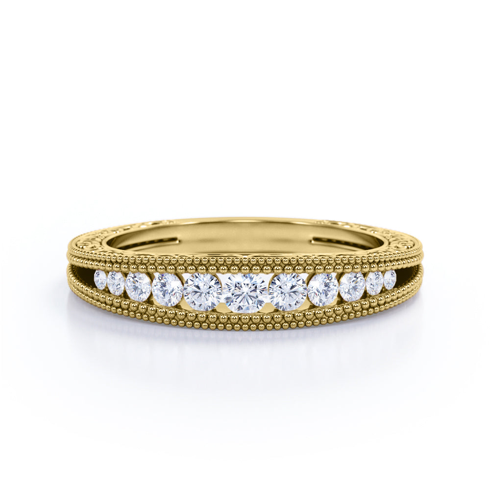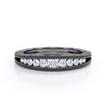 Make your proposal day most memorable with this 0.25 Carat Round Cut Diamond Wedding Band - Tapered - Milgrain and Filigree Band. Professionally handcrafted into a fine round cut by our experts in lapidary, this appealing Diamond fine jewelry features 0.25 carat Diamond stones. Distinctive and extraordinary, this Diamond jewelry is well-suited for those who are not quite into normal lifestyle. Reflective properties of this Diamond ring will unquestionably be an essential additional to any jewelry collection. This best Diamond ring is beautiful and accessible since it is available at an affordable price. If you are looking for a special gift for your friends or your better half, this Diamond ring can be a good choice for any special occasion, i.e. a birthday ring, an engagement or marriage proposal ring, a Valentines' day ring, etc. This wedding band can be customized in 18K white, rose, yellow, or black gold over silver, or in 10K, 14K, and 18K gold, based on your preference.