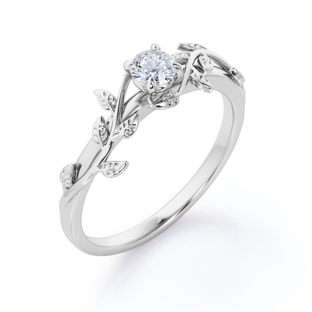 0.5 Carat Leaf Branch Round Moissanite Nature Inspired Engagement Ring in 18K White Gold Plating Over Silver