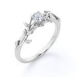 Embellish her finger with this 0.5 Carat Leaf Branch Round Moissanite Nature Inspired Engagement Ring in 18K White Gold Plating Over Silver. Professionally handcrafted into a fine round cut by our skilled jewelers, this beautiful moissanite stone ring consists of 0.5 carat moissanite on solid white gold plating over silver. Distinctive and extraordinary, this moissanite stone ring is well-suited for those who are not quite into normal lifestyle. With its glory and clarity, this moissanite white gold ring will absolutely enhance every style of its wearer. This white moissanite engagement ring is beautiful and accessible since it is available at a reasonable price. If you are looking for a special gift for your friends or your better half, this moissanite gold ring can definitely help you out. Also, this white moissanite engagement ring can be customized to your own choice of metal colors: 18K rose gold plating over silver or 18K white gold plating over silver. Let’s impress her with this colorless moissanite ring and she will be eternally joyful.