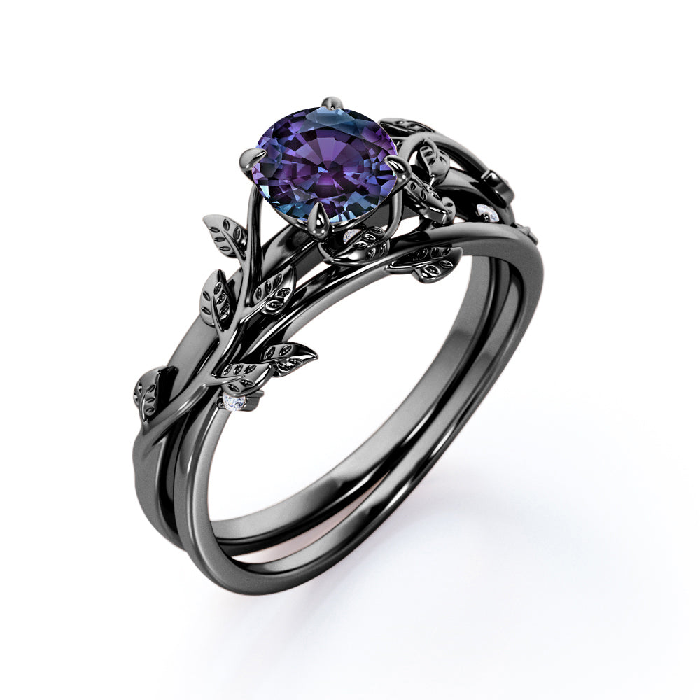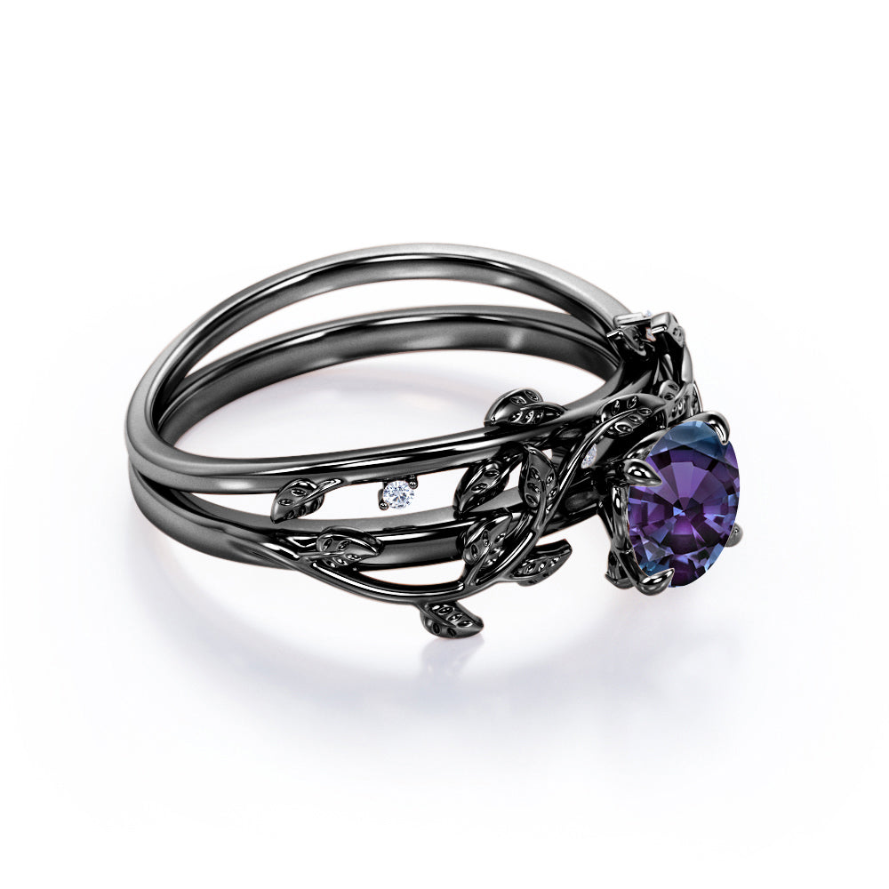 Soothe your soul with this 0.50 Carat - Round Cut Lab Created Alexandrite Ring Set - Leaf & Vine Wedding Ring Set - 18K Black Gold Plating Over Silver. Skillfully hand-cut into a nice round cut by our skilled jewelers, this alluring alexandrite gemstone ring combines 0.50 Carat alexandrite on solid rose gold plating over silver. Special and non-traditional, this alexandrite band is well-suited for those who are not quite into normal lifestyle. Reflective properties of this alexandrite ring will absolutely enhance every style of its wearer. This alexandrite bridal ring set is beautiful and accessible since it is available at an affordable price. Considered as a symbol of eternal love and affection for your lover, this alexandrite anniversary band can definitely help you out. Additionally, this alexandrite sterling silver ring can be customized to your own choice of metal colors: 18K rose gold plating over silver, 18K black gold plating over silver, or 18K white gold plating over silver. Let’s impress her with this alexandrite birthstone jewelry and she will be eternally joyful.