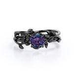 Soothe your soul with this 0.50 Carat - Round Cut Lab Created Alexandrite Ring Set - Leaf & Vine Wedding Ring Set - 18K Black Gold Plating Over Silver. Skillfully hand-cut into a nice round cut by our skilled jewelers, this alluring alexandrite gemstone ring combines 0.50 Carat alexandrite on solid rose gold plating over silver. Special and non-traditional, this alexandrite band is well-suited for those who are not quite into normal lifestyle. Reflective properties of this alexandrite ring will absolutely enhance every style of its wearer. This alexandrite bridal ring set is beautiful and accessible since it is available at an affordable price. Considered as a symbol of eternal love and affection for your lover, this alexandrite anniversary band can definitely help you out. Additionally, this alexandrite sterling silver ring can be customized to your own choice of metal colors: 18K rose gold plating over silver, 18K black gold plating over silver, or 18K white gold plating over silver. Let’s impress her with this alexandrite birthstone jewelry and she will be eternally joyful.