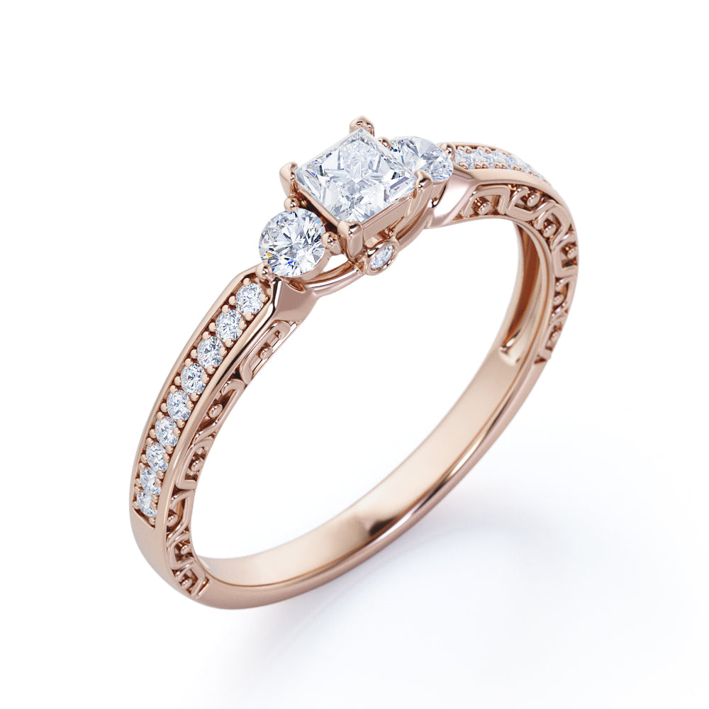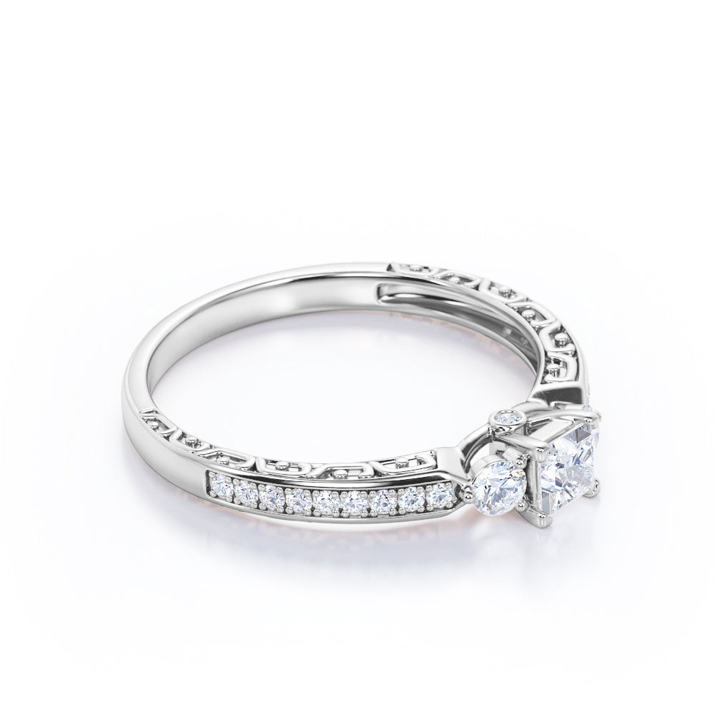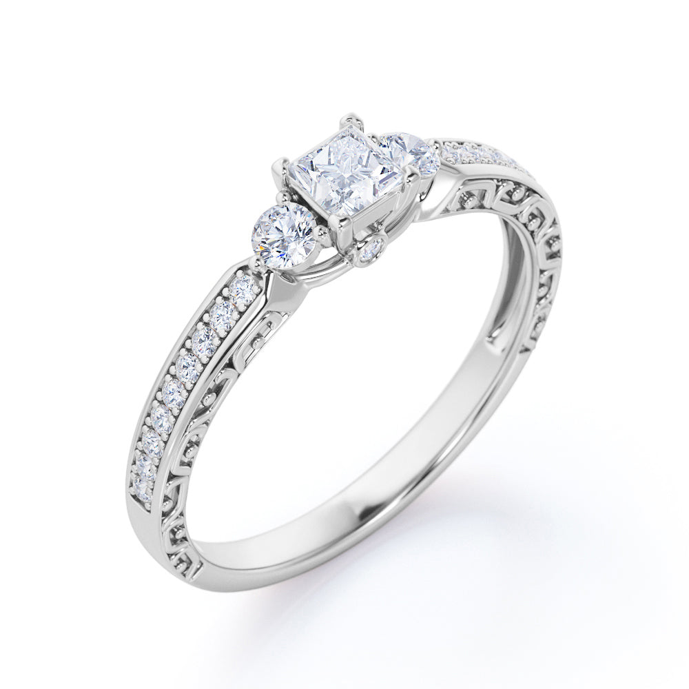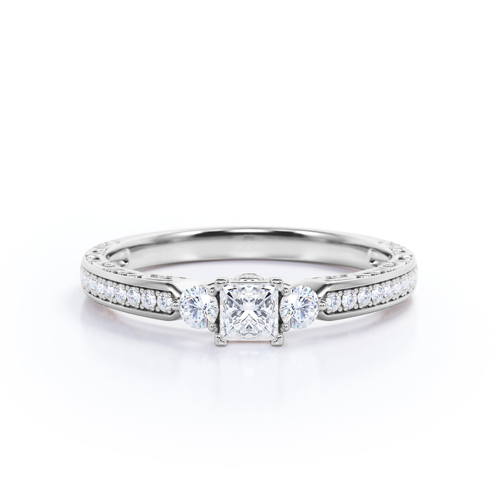 1 Ct TCW Princess Cut Diamond Channel Set Vintage Engagement Ring in White Gold. This elegant ring features a 0.5 carat princess cut center diamond, complemented by 0.5 carat of channel set side diamonds. Its classic design with a vintage touch makes it a perfect choice for those who love traditional and antique styles. Ideal for anniversaries or as a promise ring, it’s a timeless addition to any jewelry collection. Handmade with attention to detail, it can be customized in 10K, 14K, or 18K gold in white, rose, yellow, or black. Includes a 30-day full refund policy, 30-day free resizing, and a 6-month warranty.