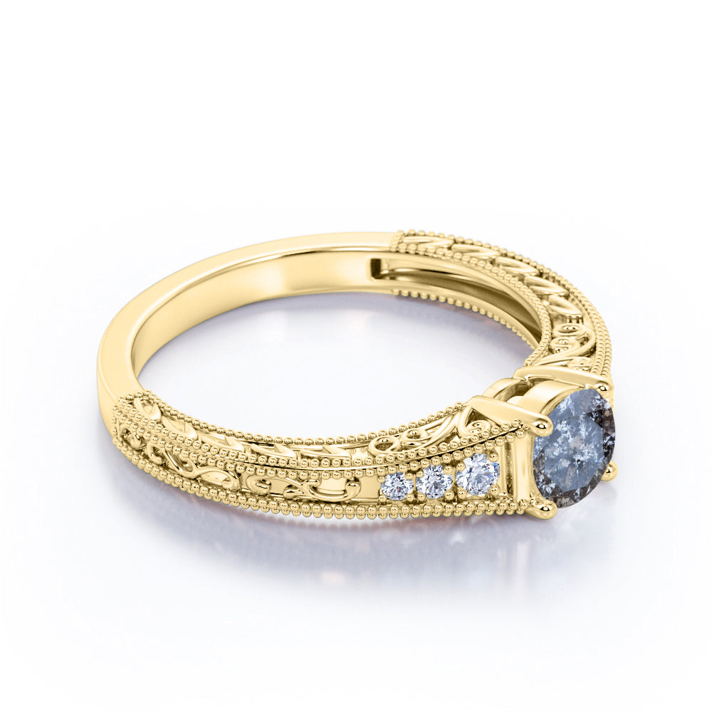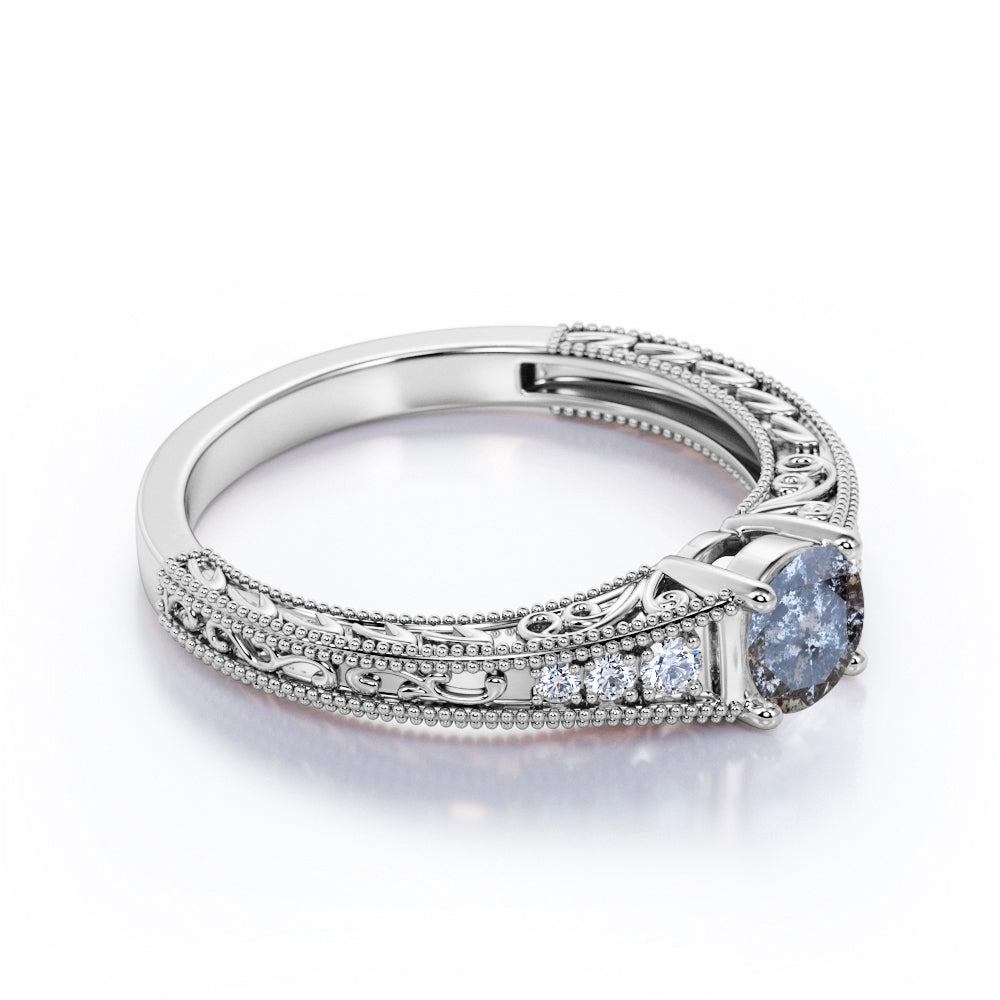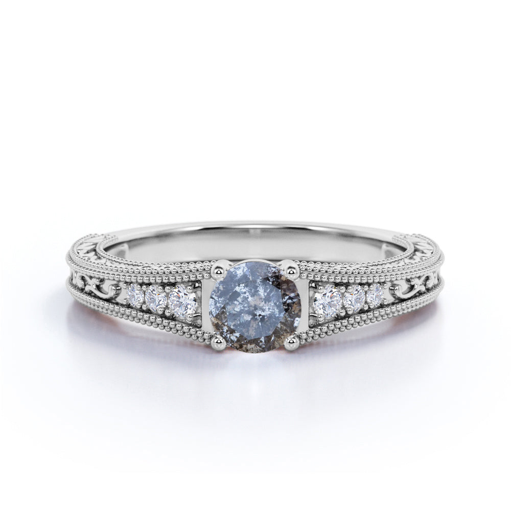 A minimalist and rustic approach, this 0.60 Carat Round Brilliant Grey Salt and Pepper Diamond Edwardian Engagement Ring in White Gold will surely make a perfect alternative engagement ring. Made with real gold and natural salt and pepper diamond, this engagement ring can be your next favorite jewelry. This affordable salt and pepper diamond engagement ring for women is beautifully handmade. Perfect gift for any occasion, whether valentine, mothers day or anniversary, this eco friendly salt and pepper diamond engagement ring will surely make your loved ones smile. This salt and pepper diamond engagement ring in gold is very trendy and fashionable. Crafted in precious Sterling Silver and in 10k, 14k or 18k Gold and can be customized to Rose Gold, White Gold or Yellow Gold, this bohemian inspired salt and pepper diamond engagement ring is carefully handmade by our passionate jewelry experts. It features .50 carat natural round cut salt and pepper diamond enhanced with .10 carat real white sparking diamonds for a total weight of .60 carat. Also, as your satisfaction is our most priority, we will do our best to have your handmade jewelry be carefully and beautifully crafted by our expert jewelers. The order also comes with a 30-day full refund policy.