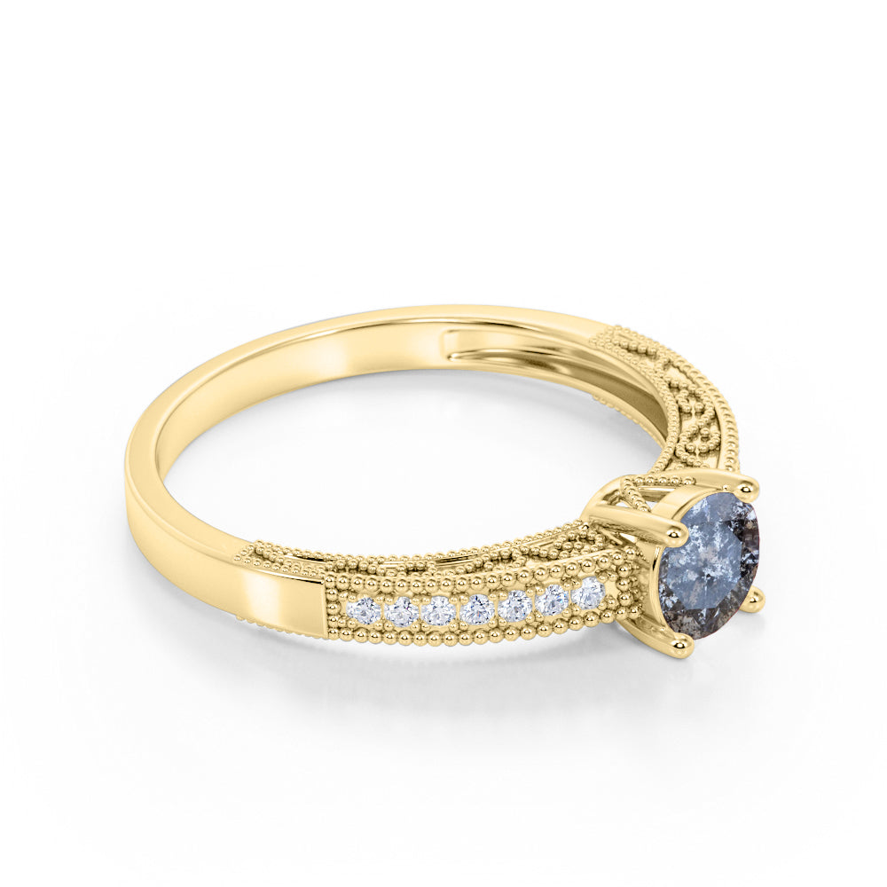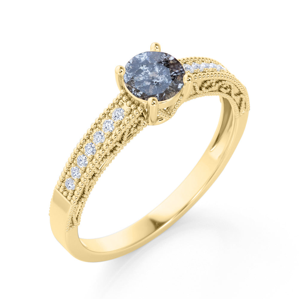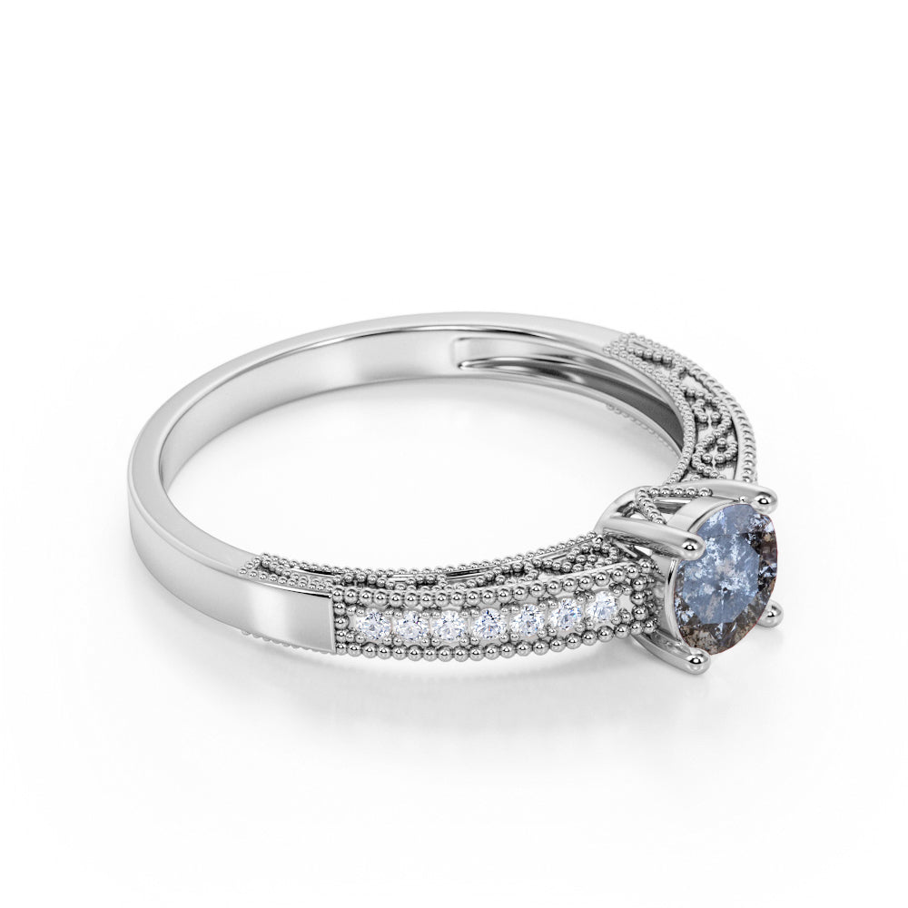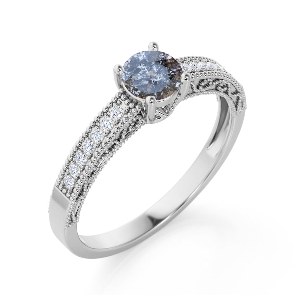 A minimalist and rustic approach, this 0.65 Carat Round Cut Grey Salt and Pepper Diamond Hand Engraved Engagement Ring in White Gold will surely make a perfect alternative engagement ring. The natural salt and pepper diamond engagement ring is made with real gold. This salt and pepper diamond engagement ring in real gold is very durable and will surely last for a lifetime. Crafted in precious Sterling Silver and in 10k, 14k or 18k Gold and can be customized to Rose Gold, White Gold or Yellow Gold, this bohemian inspired salt and pepper diamond engagement ring is carefully handmade by our passionate jewelry experts. This salt and pepper diamond engagement ring in gold is very trendy and fashionable. It features .50 carat natural round cut salt and pepper diamond enhanced with .15 carat real white sparking diamonds for a total weight of .65 carat. Also, as your satisfaction is our most priority, we will do our best to have your handmade jewelry be carefully and beautifully crafted by our expert jewelers. The order also comes with a 30-day full refund policy.