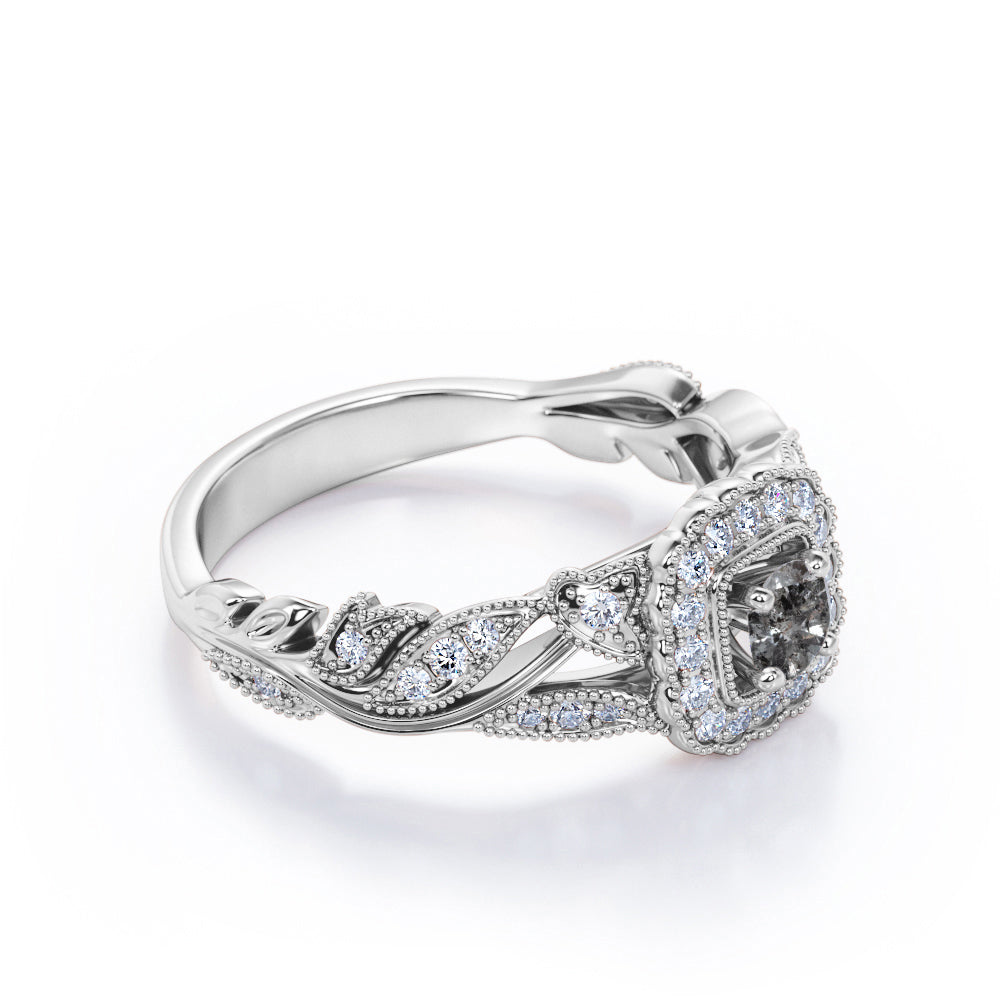 0.75 Carat Round Cut Grey Salt and Pepper Diamond Nature Inspired Engagement Ring in White Gold