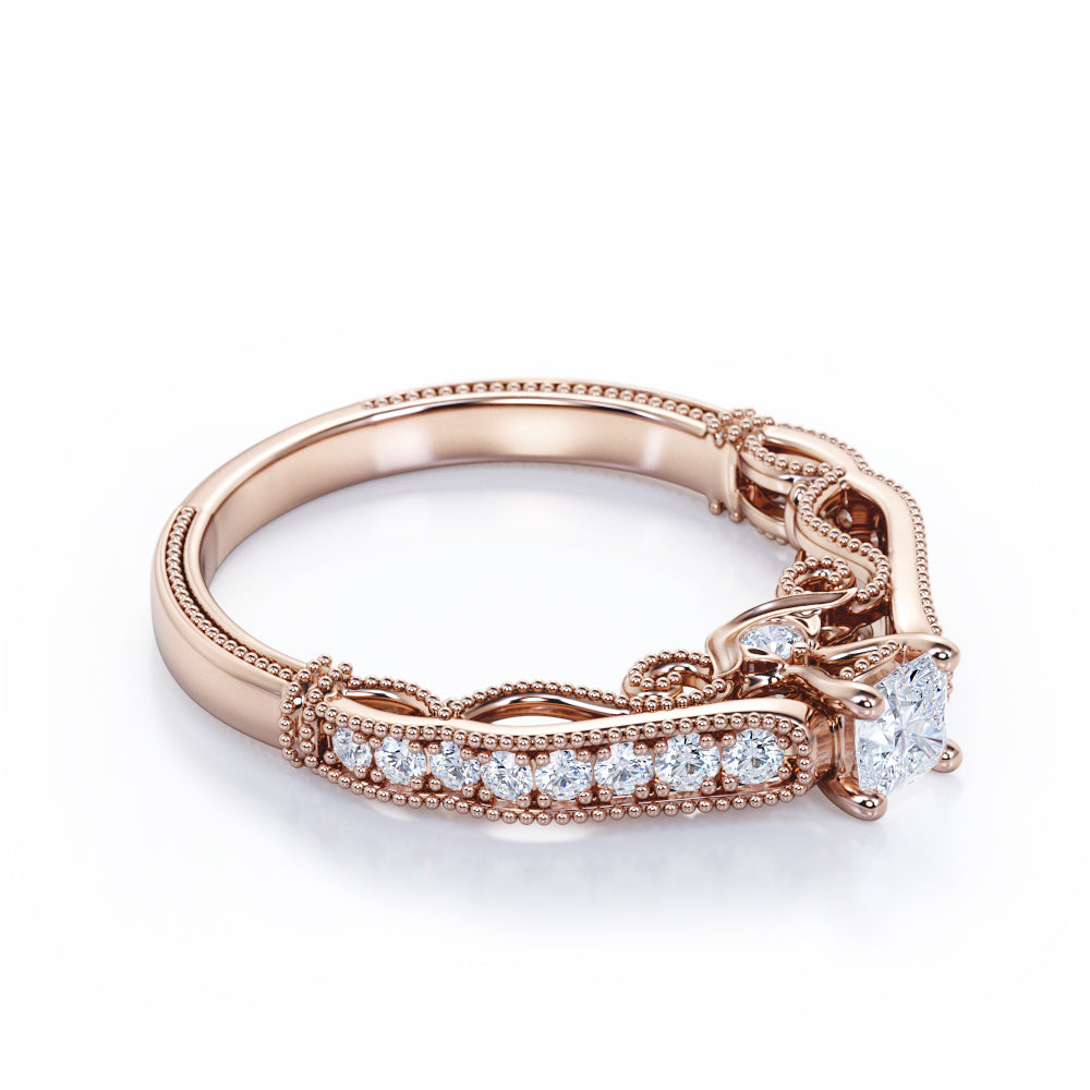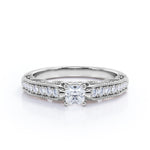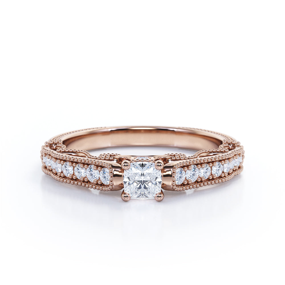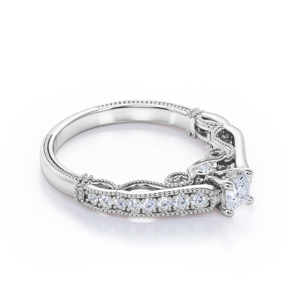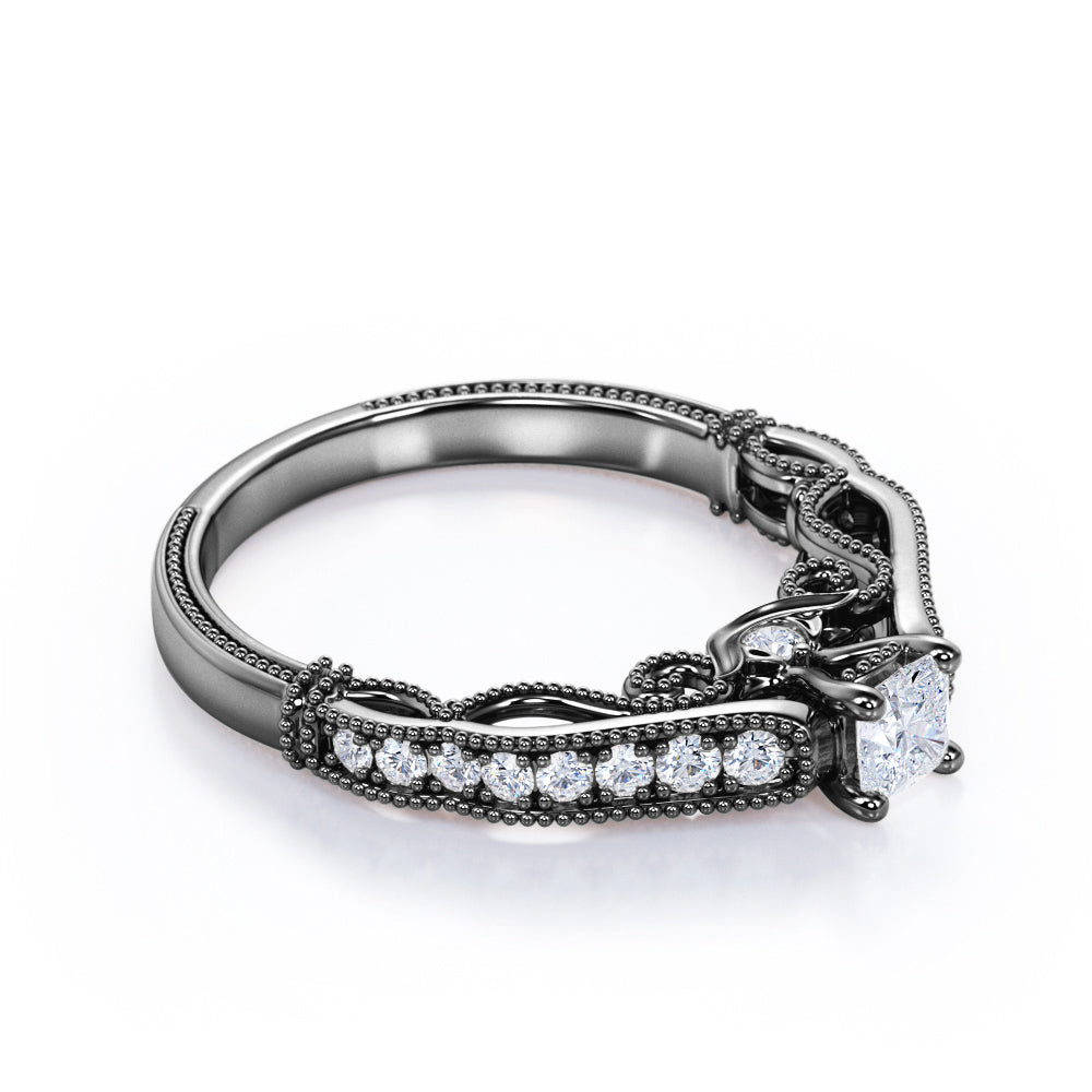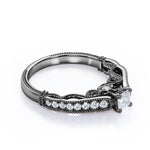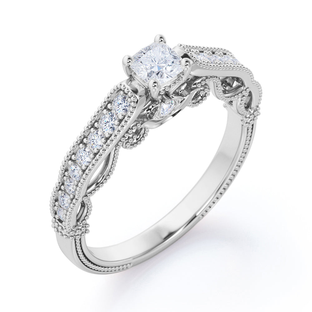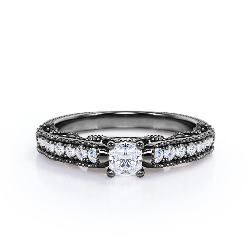 Be charmed with 0.75 carat Timepiece Jewelry Cushion Moissanite and Diamond Engagement Ring in White Gold - Mother's Day - Anniversary . Vintage jewelry is commonly being picked as a gift. To those who love old designs in a certain era, this is the best option for you. Estate ring look holds a striking Moissanite in the center and diamonds as side stone. It is garnished with bead decoration around the band. Intricate Milgrain detailing adds depth, dimension and heirloom appeal to the promise ring. Diamonds cascading down the wavey band and framed by bead art work compliment antique-inspired ring. It can be a thoughtful gift for your special someone in any occasions like birthday, new year, valentines or graduation day. All our products are handmade hence the ring can be customized, silver and gold(10k, 14k, 18k) band are up for you to choose and you can be more specific with the colors; white gold, rose gold, black gold, yellow gold