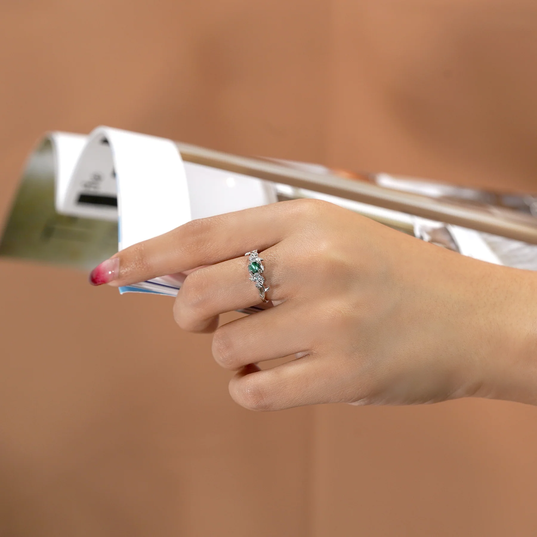 This captivating engagement ring features a 0.5-carat round Green Moss Agate as the center stone, showcasing mesmerizing natural inclusions that make each piece truly one of a kind. The graceful leaf-inspired band adds an enchanting, nature-themed touch that symbolizes growth and harmony. Side stones are Moissanite, enhancing the design with exceptional brilliance and contrast against the earthy green tones. Expertly crafted in lustrous sterling silver, this 3-stone ring embodies balance, love, and timeless beauty. Perfect for those who appreciate natural elegance with a modern twist.