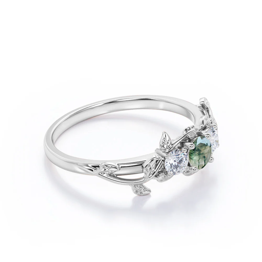 0.8 Ct Round Green Moss Agate 3-Stone Leaf Engagement Ring