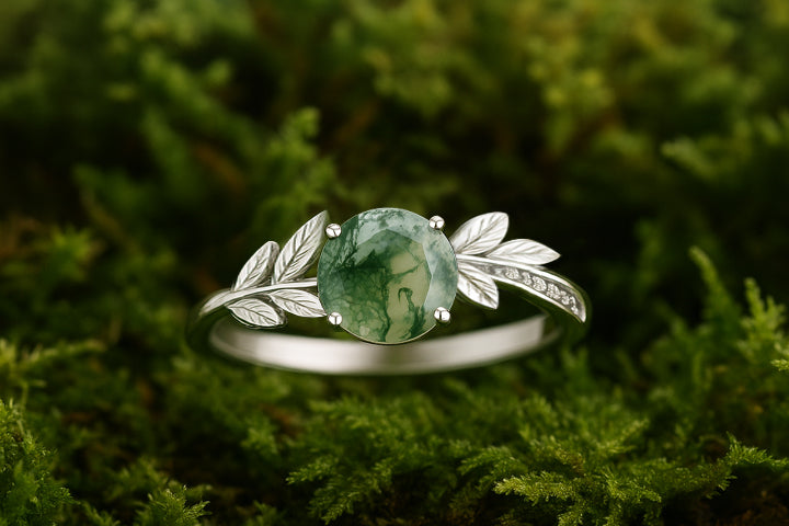 Celebrate your love with this enchanting green moss agate engagement ring, thoughtfully designed for nature lovers and romantics alike. The 1 carat round-cut moss agate centerpiece reveals captivating green inclusions, resembling a serene forest captured in stone. Delicately sculpted leaves embrace the center stone, symbolizing growth, harmony, and new beginnings. For silver-plated versions, shimmering moissanite side stones add a brilliant sparkle; for solid gold settings, the ring is accented with natural diamonds for timeless luxury. A perfect blend of organic charm and fine craftsmanship, this ring is ideal for those seeking a unique and meaningful piece.