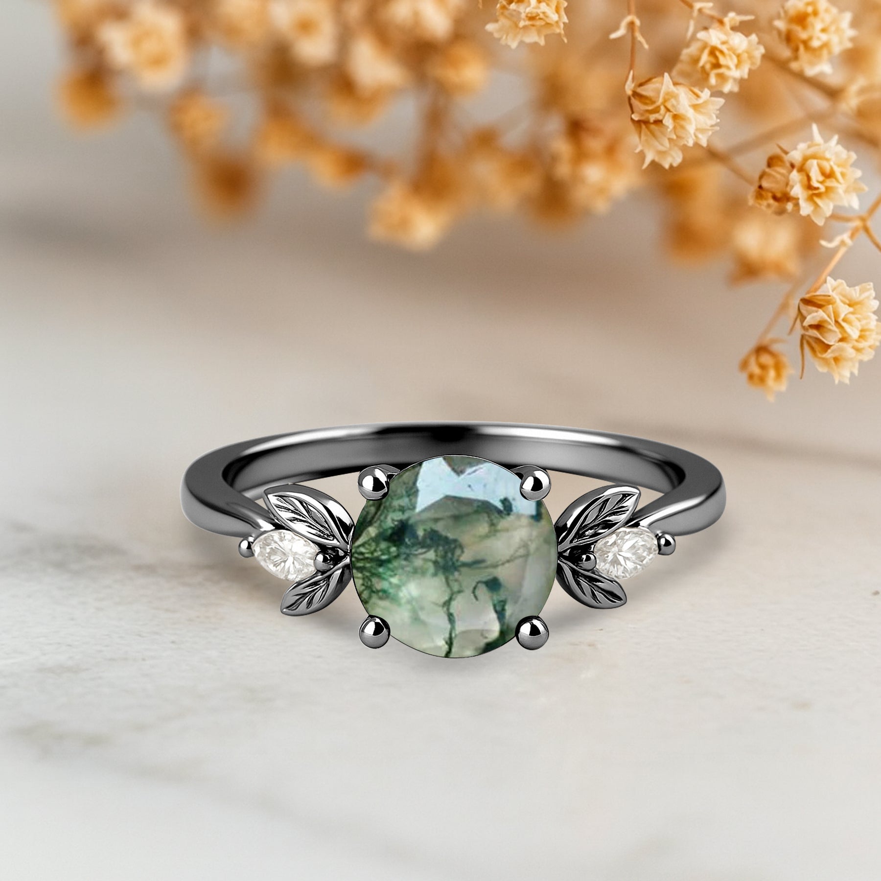 This elegant engagement ring features a mesmerizing 1-carat round Green Moss Agate as the center stone, surrounded by delicate leaf accents that enhance its natural charm. The total weight of the ring is 1.05 carats, beautifully balancing sophistication and organic allure. Each Green Moss Agate displays unique moss-like inclusions, making every piece truly one of a kind. Designed for nature-inspired brides, this ring symbolizes growth, harmony, and everlasting love. Side stones vary depending on metal type: for silver plating, side stones will be Moissanite, and for solid gold, side stones will be Diamond.
