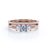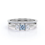 1.10 Carat Princess Cut Aquamarine And Diamond Three Stone Wedding Ring Set In White Gold. This simple yet charming bridal set will surely make your most special moment more memorable. This simple set features a three-stone engagement ring in a prong setting securely holding the stones in place while maintaining brilliance paired with a semi-eternity matching band that adds a sparkle to the set with the paved diamonds surrounding half of the the matching band. Perfect when worn together, but can also be worn separately but will still look great on your fingers. Handcrafted with passion, this wedding ring set is made with a 1 carat engagement ring, with 0.10 carat dazzling diamond side stones in the matching band for the gold rings and moissanite for the silver rings that weigh a total of 1.1 carat. Simply charming in white gold, this set is also available in rose gold, yellow gold, and black gold. Also, it can be made between 18k gold over silver, 10k gold, and 14k gold depending on your preferred customization. Please kindly note for the silver ring option that silver is a very sensitive metal, any chemicals like hand creams, lotion, or sanitizers. etc., can affect the plating.
