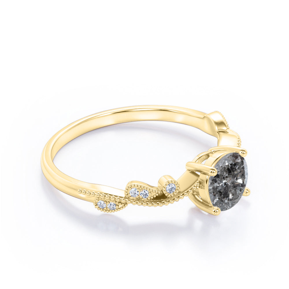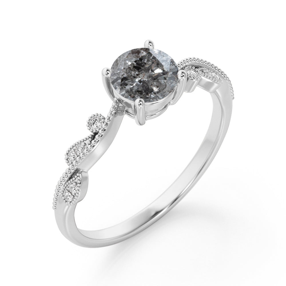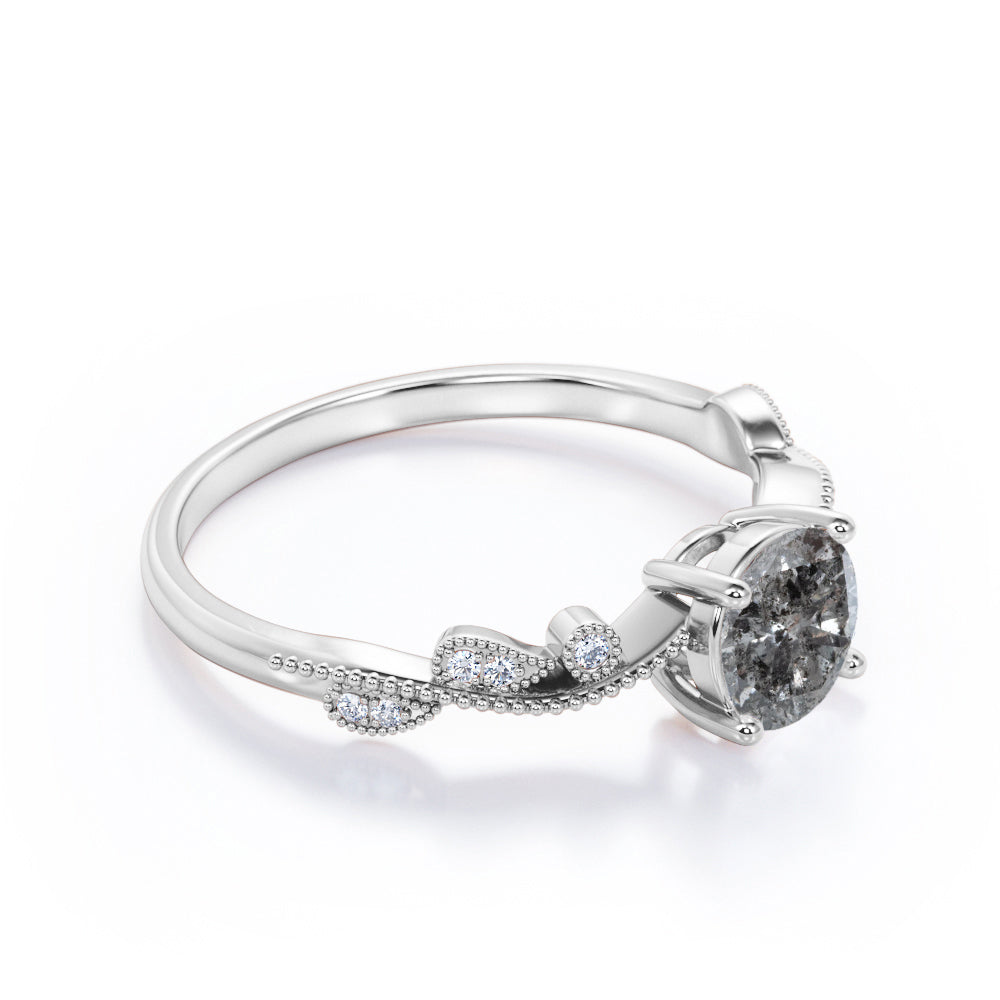 A minimalist and rustic approach, this .60 Carat Round Brilliant Dark Grey Salt and Pepper Diamond Art Deco Engagement Ring in White Gold will surely make a perfect alternative engagement ring. Made with real gold and natural salt and pepper diamond, this engagement ring can be your next favorite jewelry. The minimalist salt and pepper diamond engagement ring is perfect in either rose gold, white gold or yellow gold. Perfect gift for any occasion, whether valentine, mothers day or anniversary, this eco friendly salt and pepper diamond engagement ring will surely make your loved ones smile. This salt and pepper diamond engagement ring in gold is very trendy and fashionable. Crafted in precious Sterling Silver and in 10k, 14k or 18k Gold and can be customized to Rose Gold, White Gold or Yellow Gold, this bohemian inspired salt and pepper diamond engagement ring is carefully handmade by our passionate jewelry experts. It features .50 carat natural round cut salt and pepper diamond enhanced with .10 carat real white sparking diamonds for a total weight of .60 carat. Also, as your satisfaction is our most priority, we will do our best to have your handmade jewelry be carefully and beautifully crafted by our expert jewelers. The order also comes with a 30-day full refund policy.