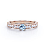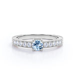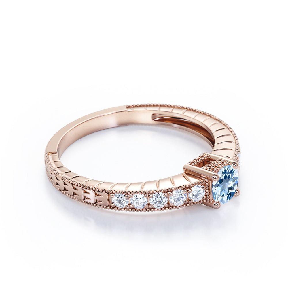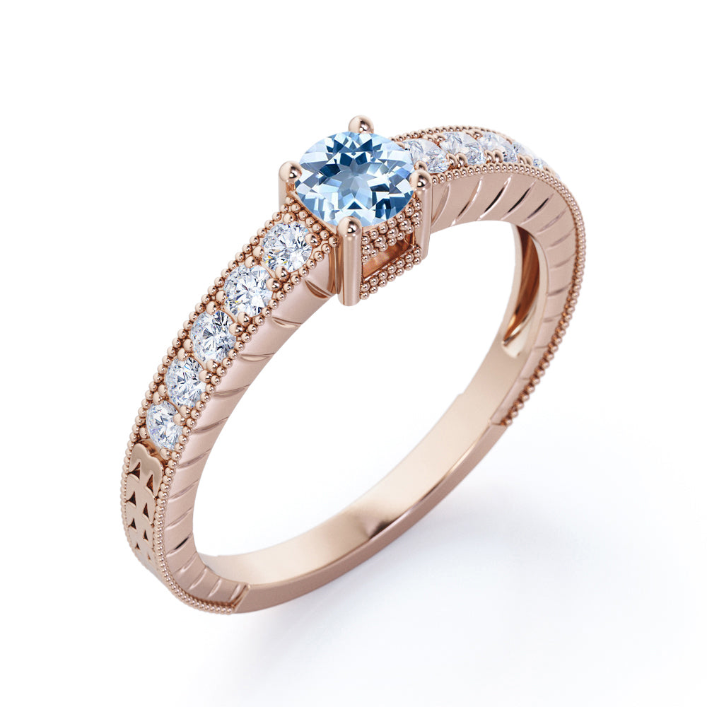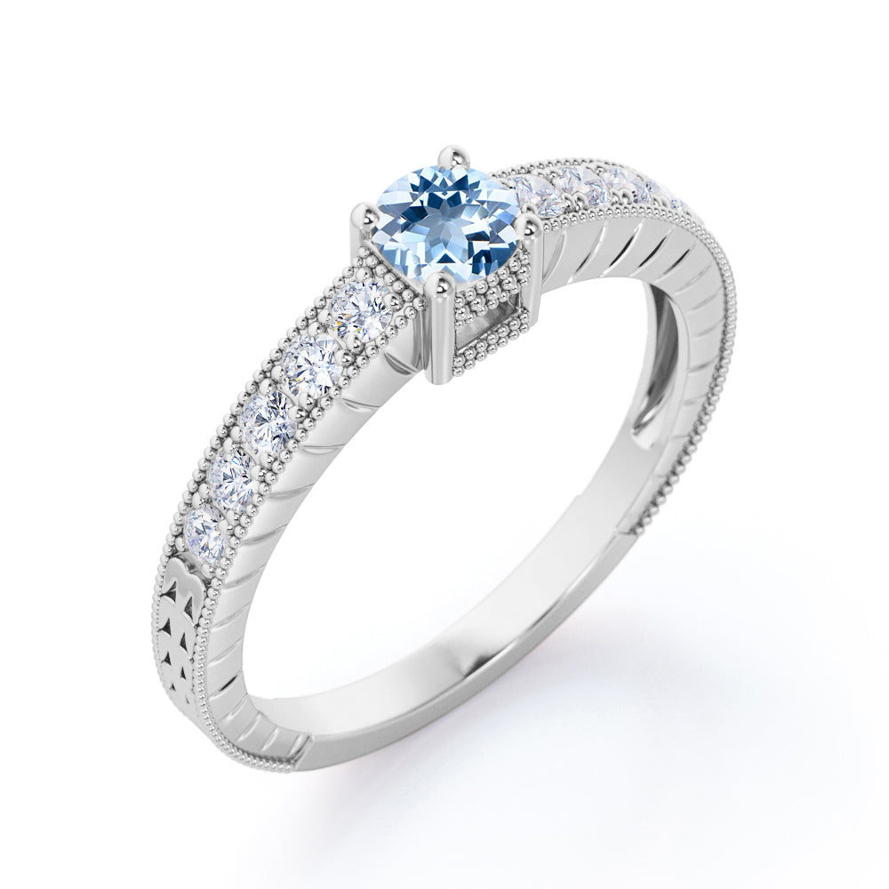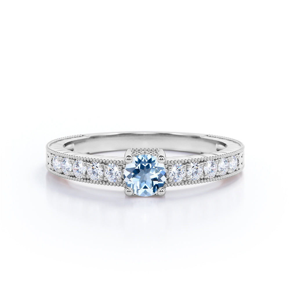 1.10 Carat Round Cut Aquamarine And Diamond Antique Engagement Ring In White Gold. This subtle piece will surely tie the knot. The ring highlights a very fine blue aquamarine center stone, this promise ring is simply stunning. Paved with dazzling diamond side stones the ring will definitely sparkle when viewed from any angle. Detailed with intricate milgrain detailing along the band that is beautifully crafted by our talented and experienced jewelers. The modern promise ring features a 1 carat perfect blue aquamarine center stone, surrounded by 0.10 carat dazzling diamond side stones for the gold rings and moissanite for the silver rings that weigh a total of 1.10. This would also be a great addition to your jewelry collection as vintage rings will never go out of style. Simply stunning in white gold, this promise ring is also available in rose gold, yellow gold, and black gold. Also, it can be made between 18k over silver, 10k gold, and 14k gold depending on your preferred customization. Please kindly note for the silver ring option that silver is a very sensitive metal, any chemicals like hand creams, lotion, or sanitizers. etc., can affect the plating.