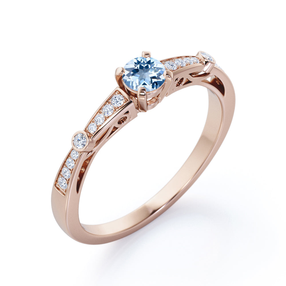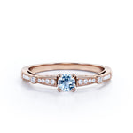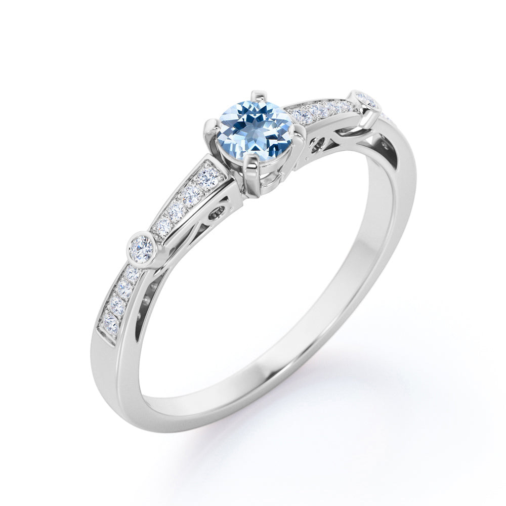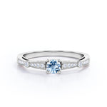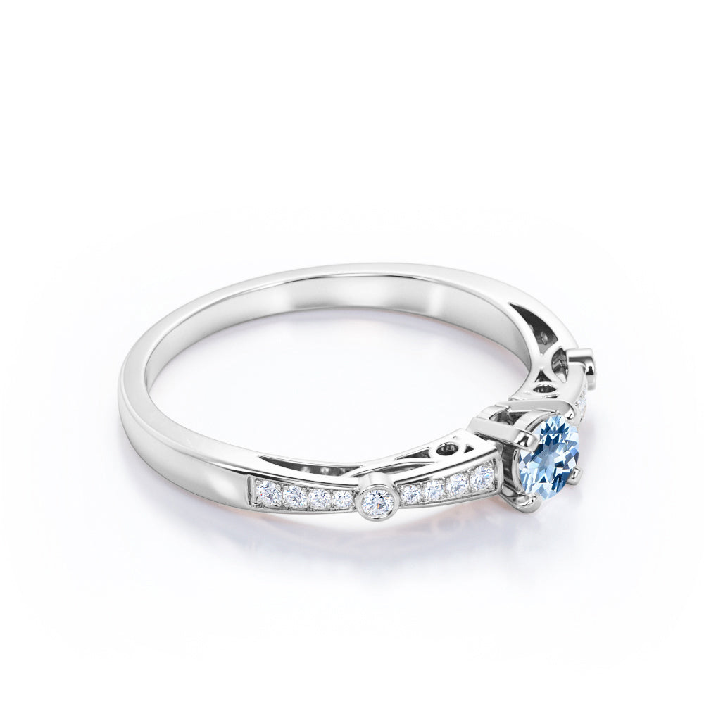 1.10 Carat Round Cut Aquamarine And Diamond Channel Set Engagement Ring In White Gold. Add some bling to your fingers with this modern promise ring. The engagement ring features a very fine blue aquamarine center stone set in a four-prong securely holding the stone in place while channel-set diamond side stones are settled in the ring band that will surely sparkle when viewed from any angle. If you are looking for the perfect gift for your girlfriend, wife, mother, or any special woman in your life, this lovely ring is a perfect option for you. It can also be a great addition to your everyday wear as it would definitely match any outfit in your closet. Handcrafted with passion, this lovely engagement ring features a 1 carat very fine round aquamarine center stone, surrounded by, 0.1 carat dazzling diamond side stones for the gold rings and moissanite for the silver rings that weigh a total of 1.10 carat. Lovely in white gold, this promise ring is also available in rose gold, yellow gold, and black gold. Also, it can be made between 18k gold over silver, 10k gold, and 14k gold depending on your preferred customization. Please kindly note for the silver ring option that silver is a very sensitive metal, any chemicals like hand creams, lotion, or sanitizers. etc., can affect the plating.