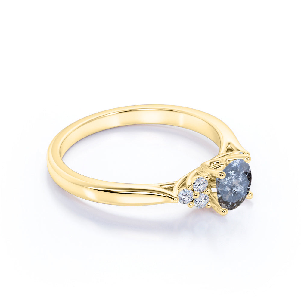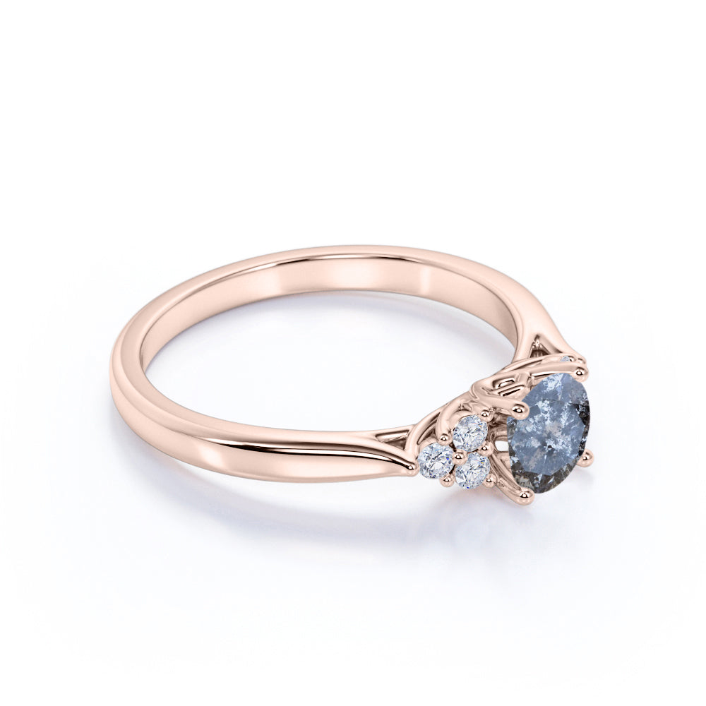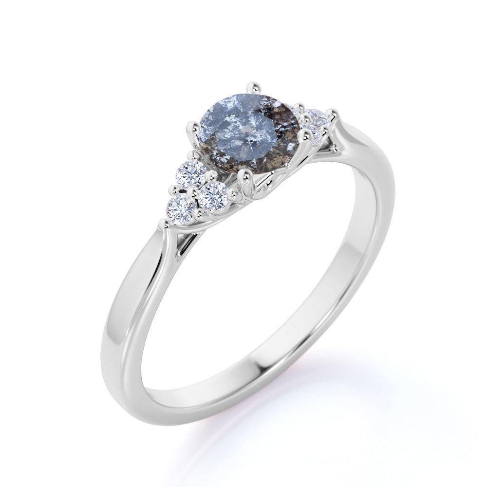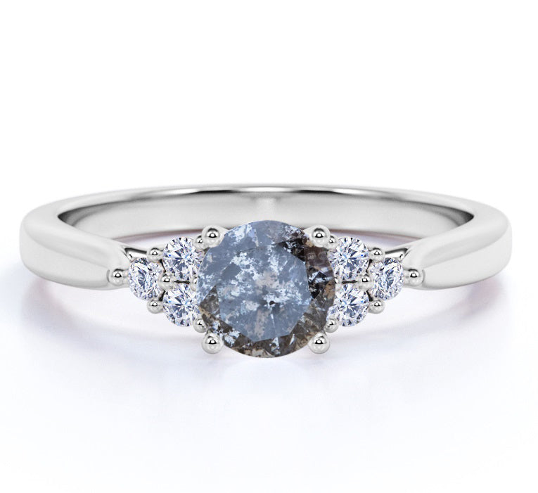 A minimalist and rustic approach, this 0.60 Carat Round Cut Natural Salt and Pepper Diamond 7 Stone Engagement Ring in White Gold will surely make a perfect alternative engagement ring. The natural salt and pepper diamond engagement ring is made with real gold. This affordable salt and pepper diamond engagement ring for women is beautifully handmade. Crafted in precious Sterling Silver and 10k, 14k or 18k Gold, this bohemian inspired salt and pepper diamond engagement ring is carefully handmade by our passionate jewelry experts. This salt and pepper diamond engagement ring in gold is very trendy and fashionable. It features 0.50 carat natural round cut salt and pepper diamond enhanced with .10 carat real white sparking diamonds for a total weight of 0.60 carat. Also, as your satisfaction is our most priority, we will do our best to have your handmade jewelry be carefully and beautifully crafted by our expert jewelers. The order also comes with a 30-day full refund policy.