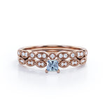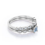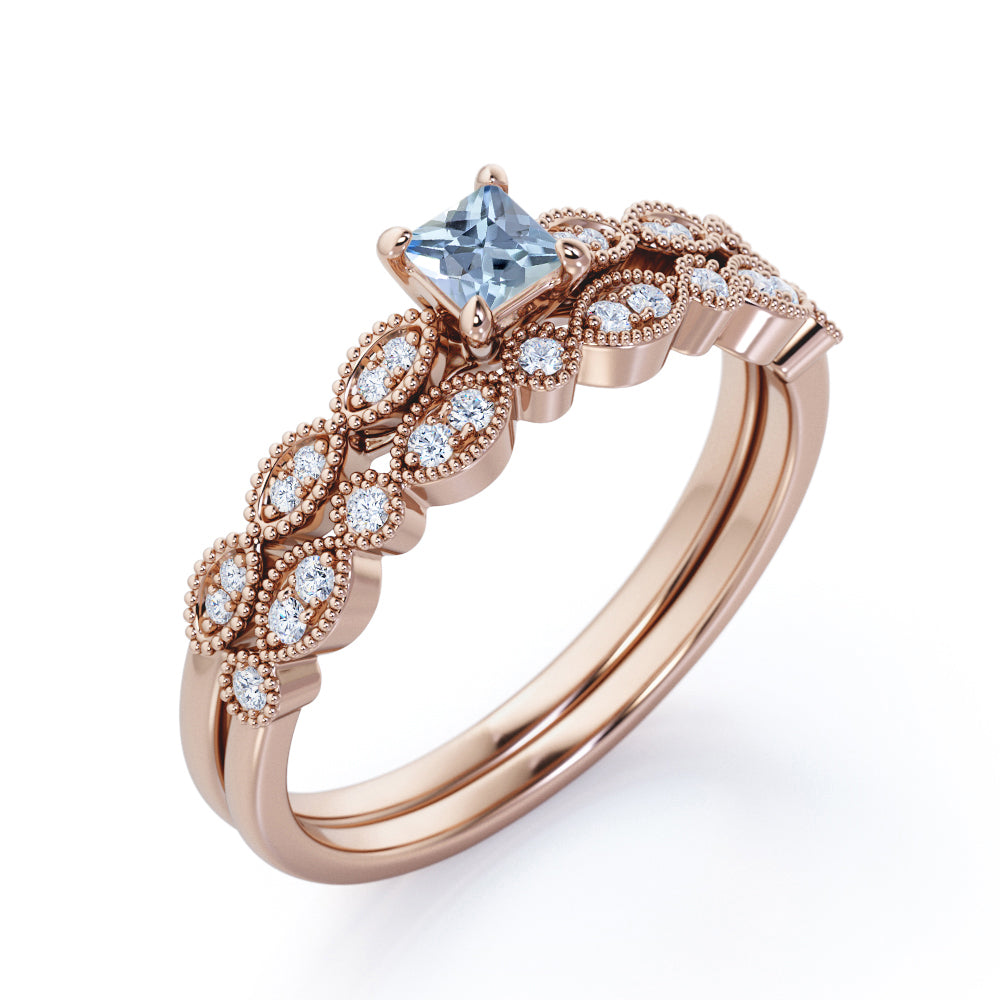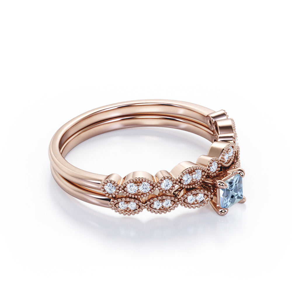 Unique 1.15 Carat Princess Cut Aquamarine And Diamond Art Deco Wedding Ring Set In White Gold. This lovely set is a perfect option for those who love minimalist ring designs. The set highlights a dazzlingly blue aquamarine center stone set in a prong setting securely holding the stone while maintaining brilliance while paved diamond side stones surround the bands along with the leaf art deco design edged with intricate milgrain beadings perfectly handcrafted by our talented and experienced jewelers. Handcrafted with passion, this nature-inspired promise ring is made with 1 perfectly polished princess-cut blue aquamarine center stone, surrounded by 0.15 carat dazzling round diamond side stones for the gold rings and moissanite for the silver rings that weigh a total of 1.15 carat. Simply classic in white gold, this vintage engagement ring is also available in rose gold, yellow gold, and black gold. Also, it can be made between 18k gold over silver, 10k gold, and 14k gold depending on your preferred customization. Please kindly note for the silver ring option that silver is a very sensitive metal, any chemicals like hand creams, lotion, or sanitizers. etc., can affect the plating.
