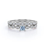 Unique 1.15 Carat Princess Cut Aquamarine And Diamond Art Deco Wedding Ring Set In White Gold