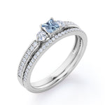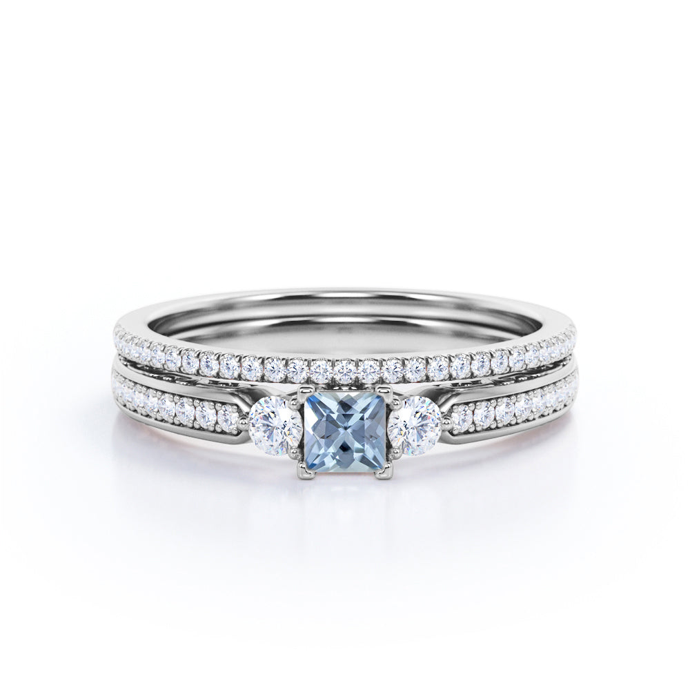 1.15 Carat Princess Cut Aquamarine And Diamond Channel Wedding Ring Set In White Gold. Make your most unforgettable moment extra special with this antique wedding ring set. The lovely set features a crystal clear blue aquamarine center stone with two brilliant diamond side stones set in a prong setting securely holding the stones in place while maintaining brilliance while channel-set diamond side stones surround the promise ring band detailed with art deco engravings beautifully handcrafted by our talented and experienced jewelers. The matching band of this bridal features paved diamond stones that add extra sparkle to the whole set. Handcrafted with passion, this art deco wedding ring set is made with 1 carat perfect blue princess-cut aquamarine center stone, surrounded by, 0.15 carat round dazzling diamond side stones for the gold rings and moissanite for the silver rings that weigh a total of 1.15 carat. Simply elegant in white gold, this art deco promise ring can also be customized between white gold, yellow gold, or black gold. Also, it can be made between 18k gold over silver, 10k gold, and 14k gold depending on your preferred customization. Please kindly note for the silver ring option that silver is a very sensitive metal, any chemicals like hand creams, lotion, or sanitizers. etc., can affect the plating.