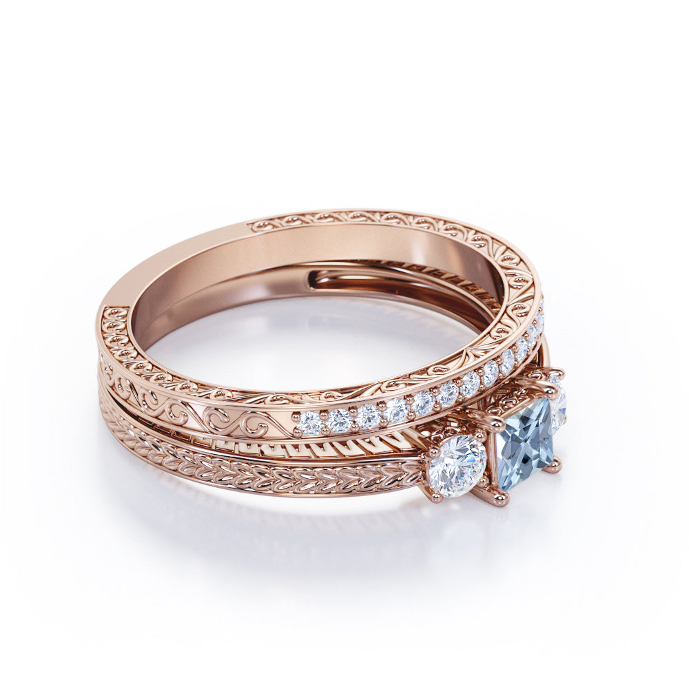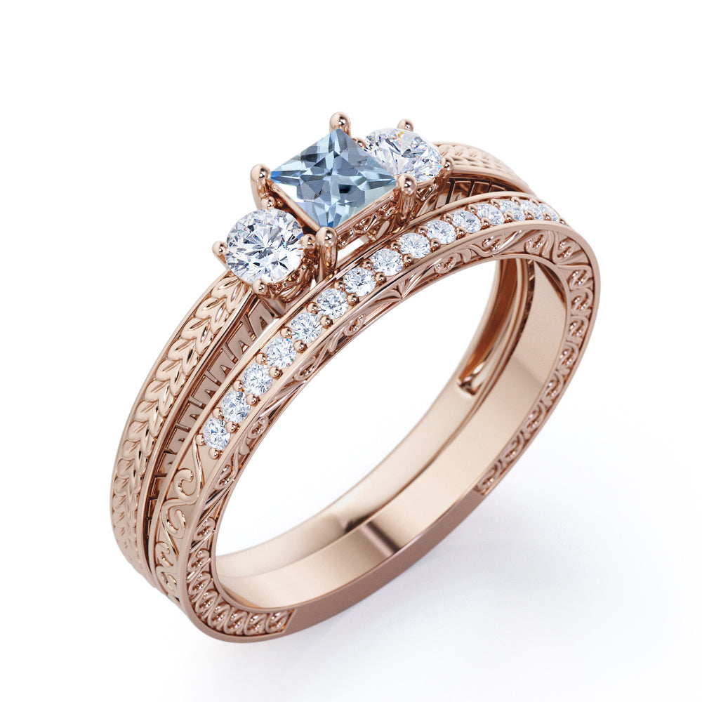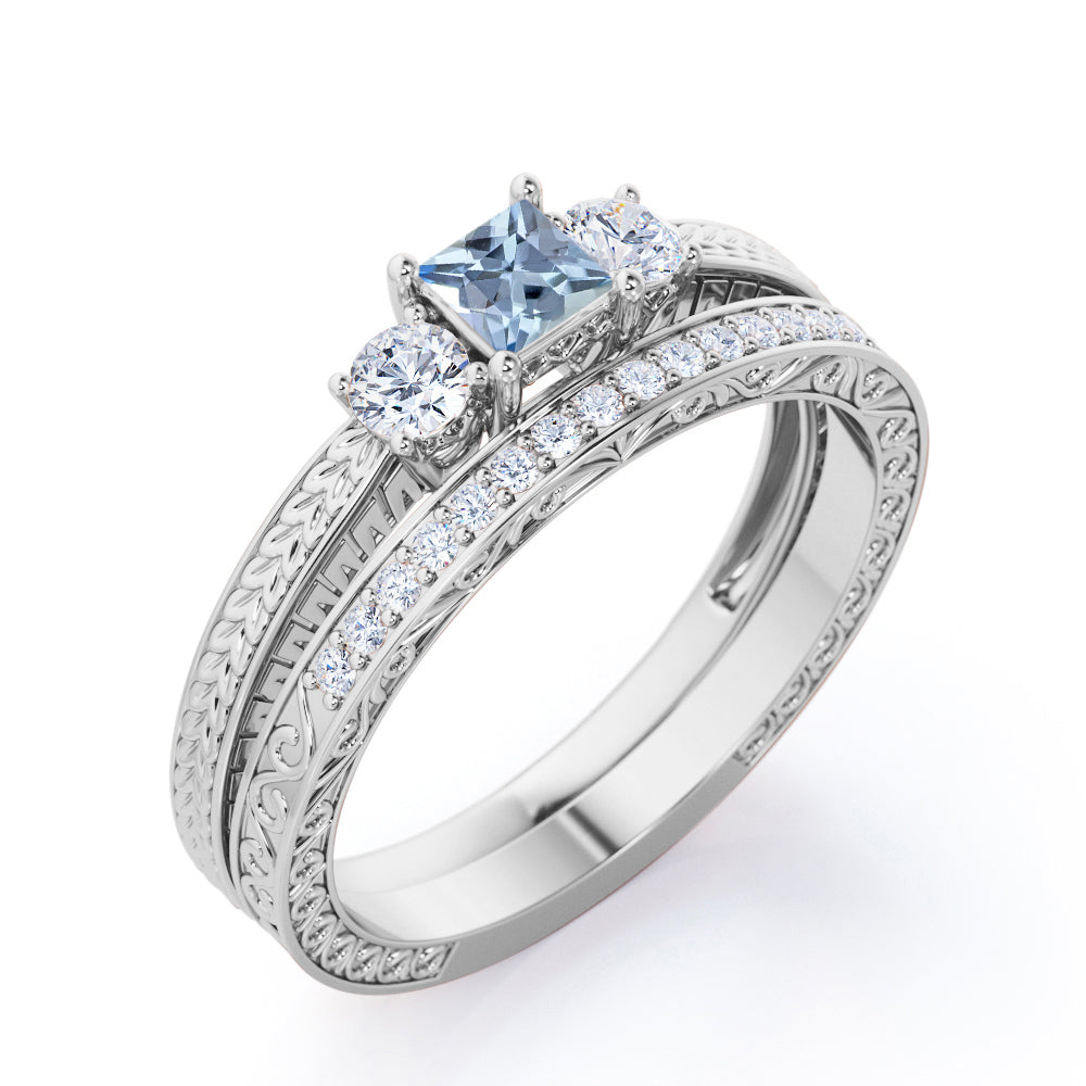 1.15 Carat Princess Cut Aquamarine And Diamond Three Stone Wedding Ring Set In White Gold. Just like your love, this bridal set is timeless and classic. This wedding ring set highlights a perfectly engraved art deco on the shank that is giving off a very classic look to the ring. The three-stone engagement ring features the prong setting securely holding the stones in place while maintaining its brilliance. Paved diamonds are settled in the wedding band that complements very well to the classic look of the ring. Handcrafted with passion, this timeless wedding ring set features a perfectly blue princess-cut aquamarine center stone, surrounded by, dazzling round diamond side stones for the gold rings and moissanite for the silver rings that weigh a total of 1.15 carat. Lovely in white gold, this bridal set is also available in rose gold, yellow gold, or black gold. Also, it can be made between 18k gold over silver, 10k gold, and 14k gold depending on your preferred customization. Please kindly note for the silver ring option that silver is a very sensitive metal, any chemicals like hand creams, lotion, or sanitizers. etc., can affect the plating.