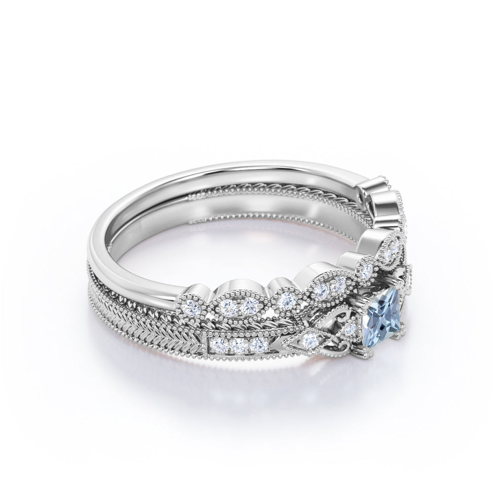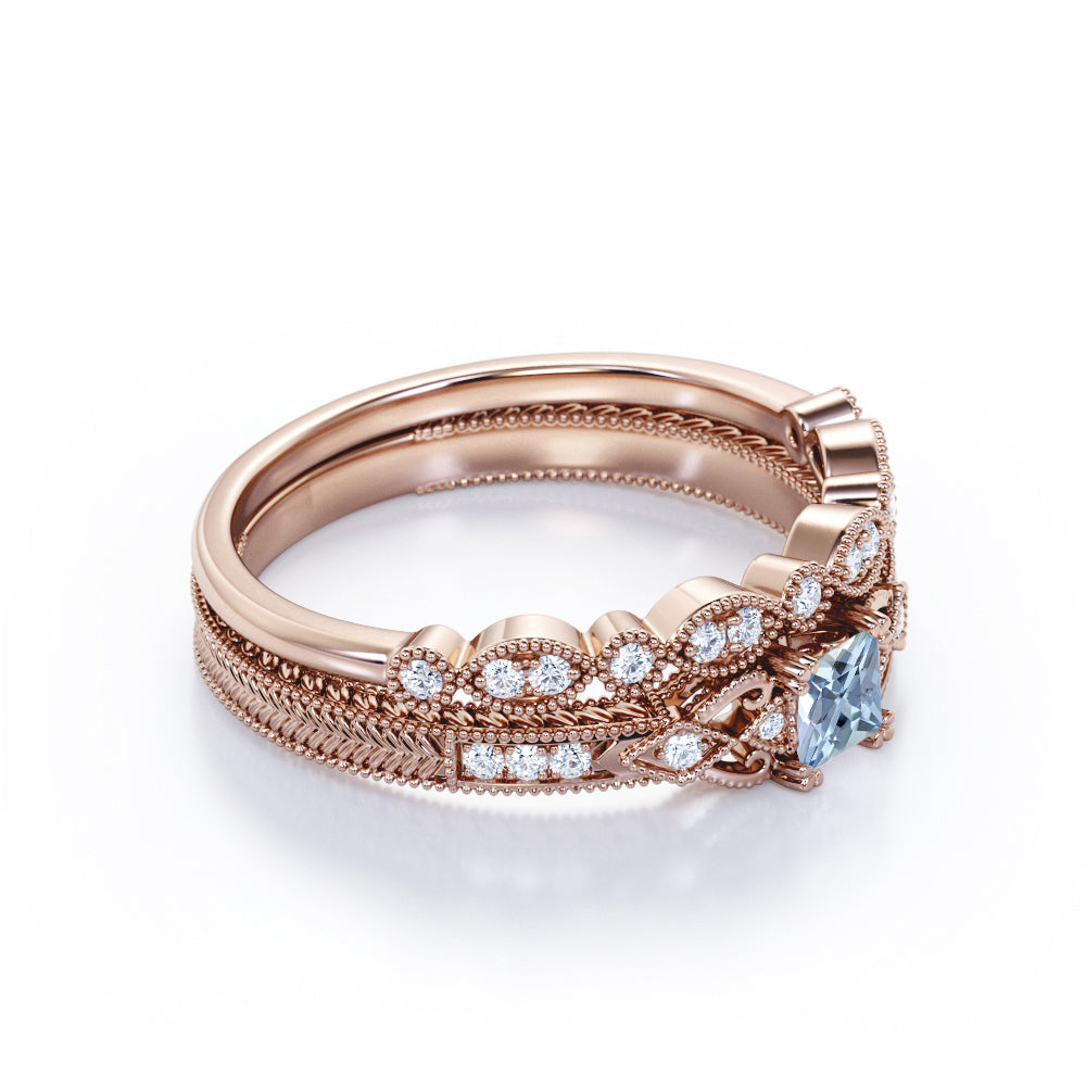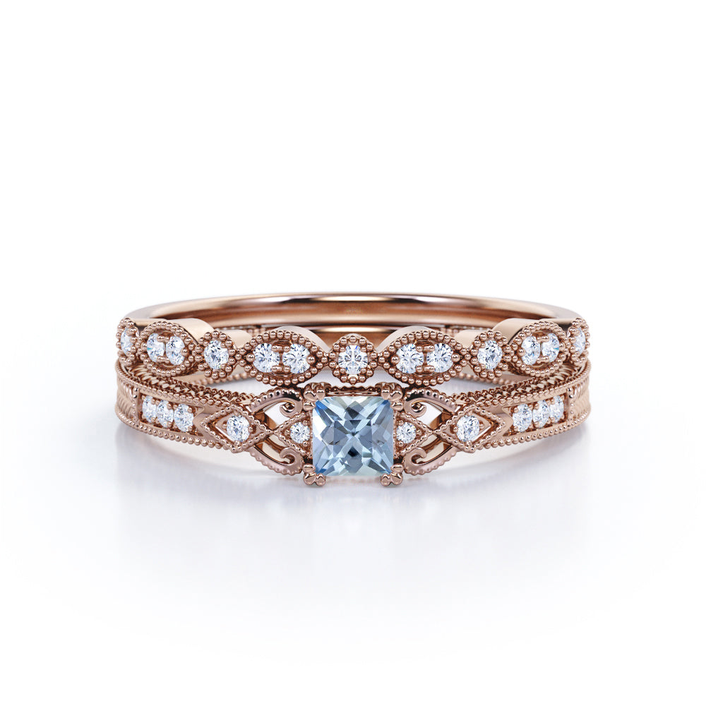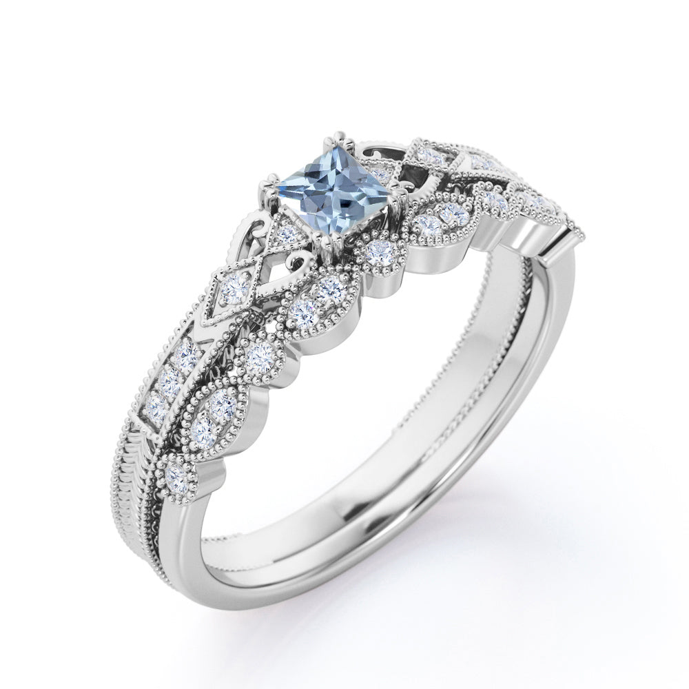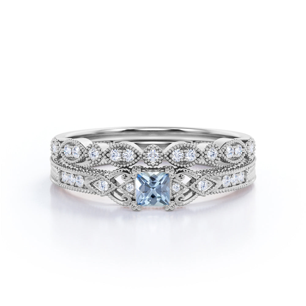 1.15 Carat Princess Cut Aquamarine And Diamond Vintage Milgrain Wedding Ring Set In White Gold
