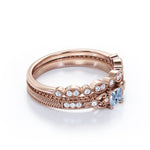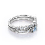 1.15 Carat Princess Cut Aquamarine And Diamond Vintage Milgrain Wedding Ring Set In White Gold. Create your most memorable moment with this vintage bridal set. Any bride will definitely love this gorgeous wedding ring set. The set highlights a dazzling blue aquamarine center stone that is very soothing to the eyes surrounded by paved diamonds that sparkle brilliantly. Giving off the vintage look, this bridal set also highlights intricate milgrain details in the engagement ring band and the matching wedding band that is beautifully handcrafted by our talented and experienced jewelers. Handcrafted with passion, this art deco set features a 1 carat perfect blue princess-cut aquamarine center stone, surrounded by 0.1 carat dazzling diamond side stones for the gold rings and moissanite for the silver rings that weigh a total of 1.1 carat. Stunning in white gold, this antique wedding set is also available in rose gold, yellow gold, and black gold. Also, it can be made between 18k gold over silver, 10k gold, and 14k gold depending on your preferred customization. Please kindly note for the silver ring option that silver is a very sensitive metal, any chemicals like hand creams, lotion, or sanitizers. etc., can affect the plating.