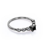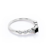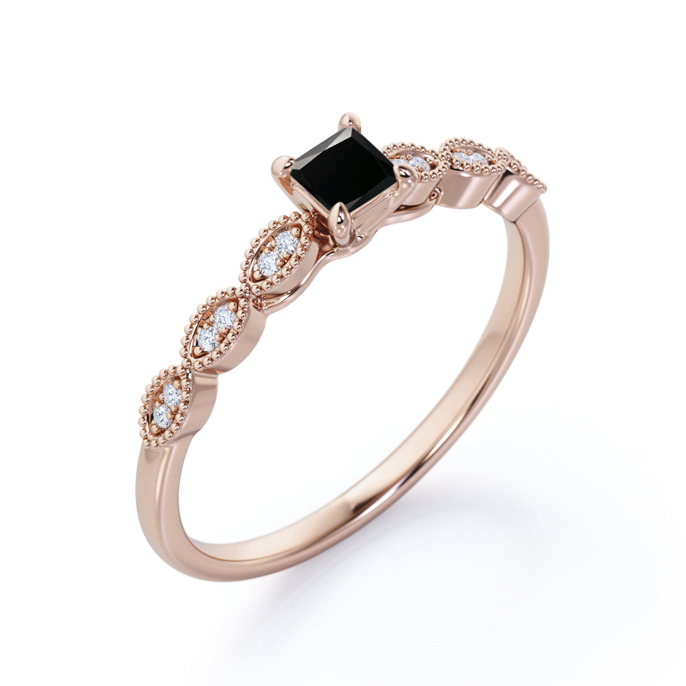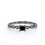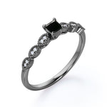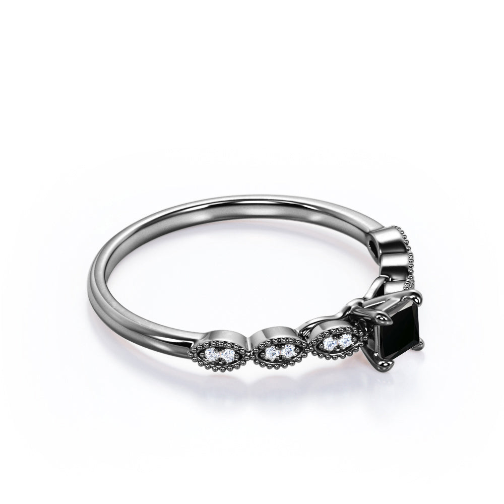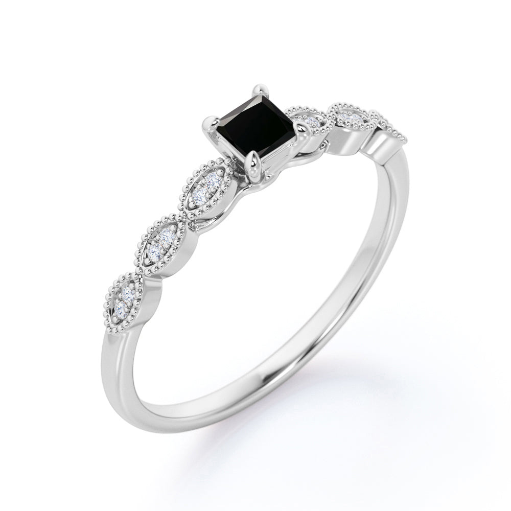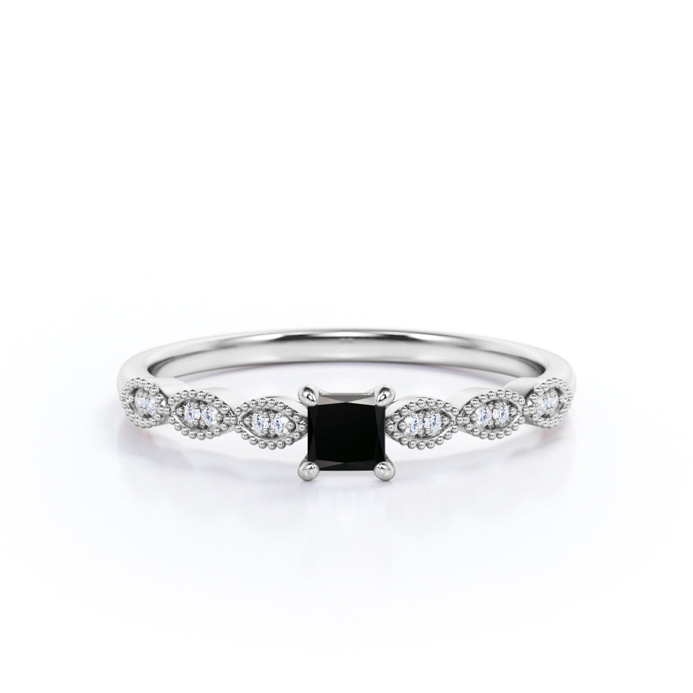 1.15 carat princess cut Lab Grown Black Diamond 4 prong art deco engagement ring in white gold. Lab Grown Black Diamonds are forever so make this timeless Lab Grown Black Diamond engagement ring yours to cherish your golden memories forever as well. This princess cut engagement ring features 1 carat Lab Grown Black Diamond at the center which is embedded with 0.15 carat shimmering diamonds. The art deco work on it makes this ring a unique piece. This prong set style radiates great brilliance and unbelievable sparkle. This vintage engagement ring will add certain grace to your ensemble. This 1.15 carat princess cut Lab Grown Black Diamond engagement ring in white gold can also be customized to 10k Gold, 14k Gold as you like.