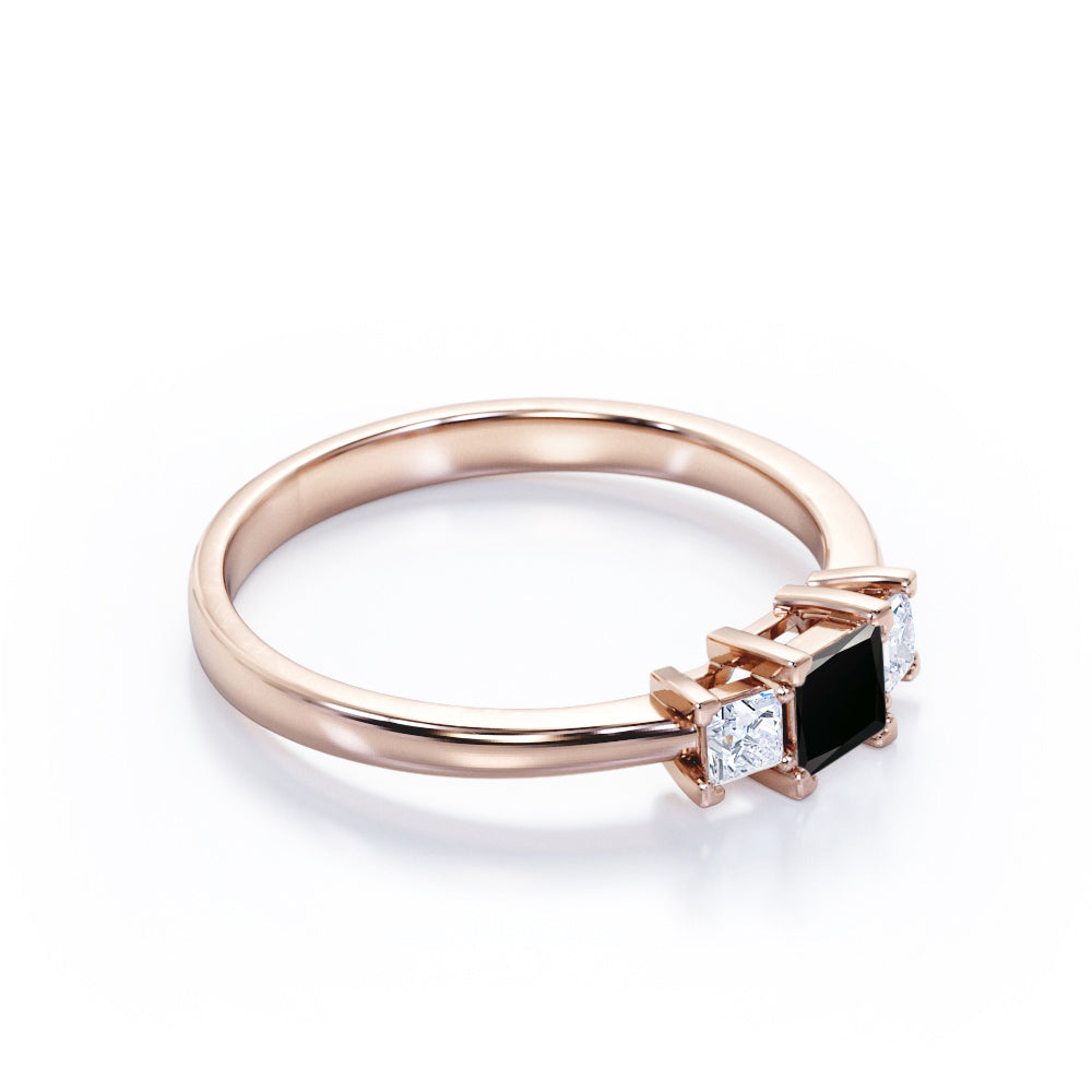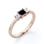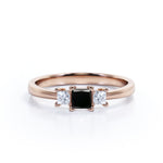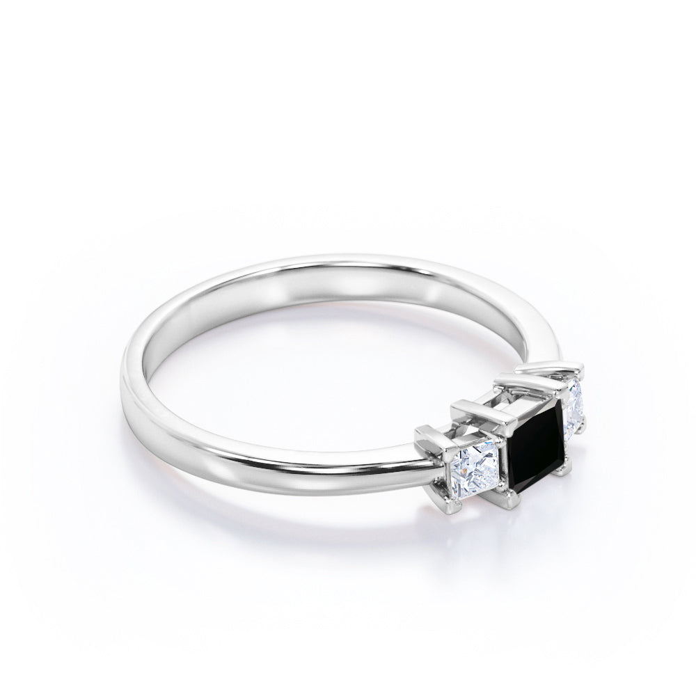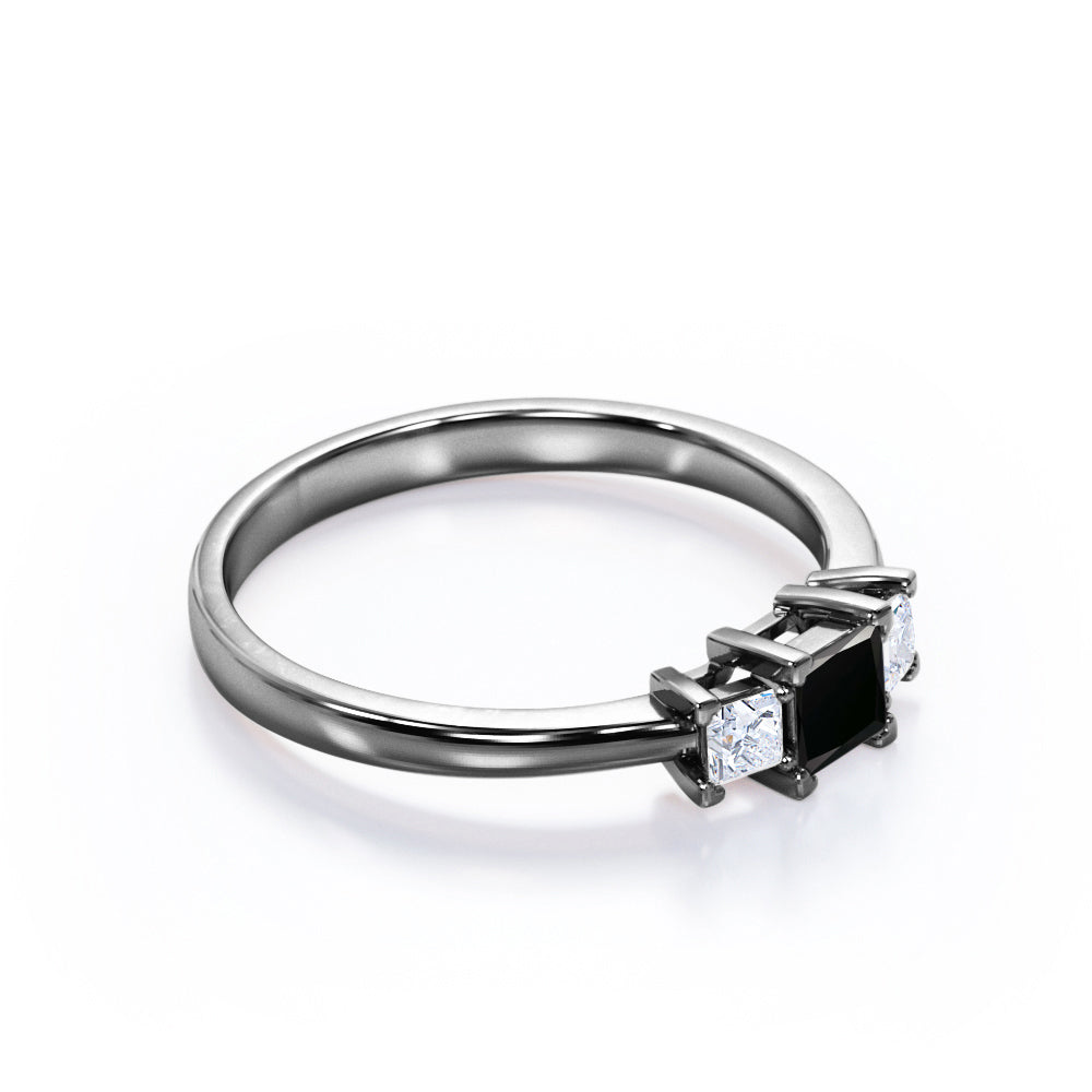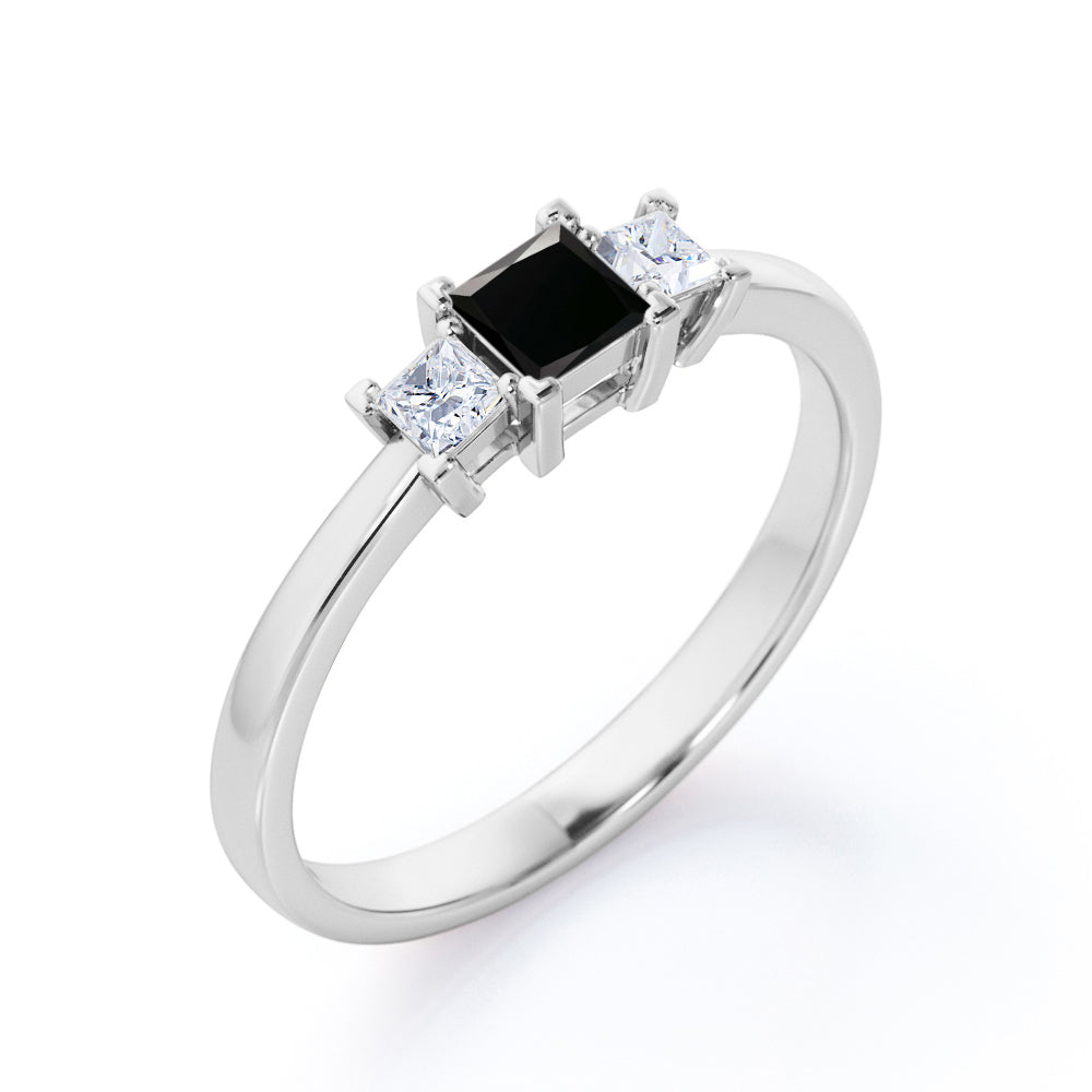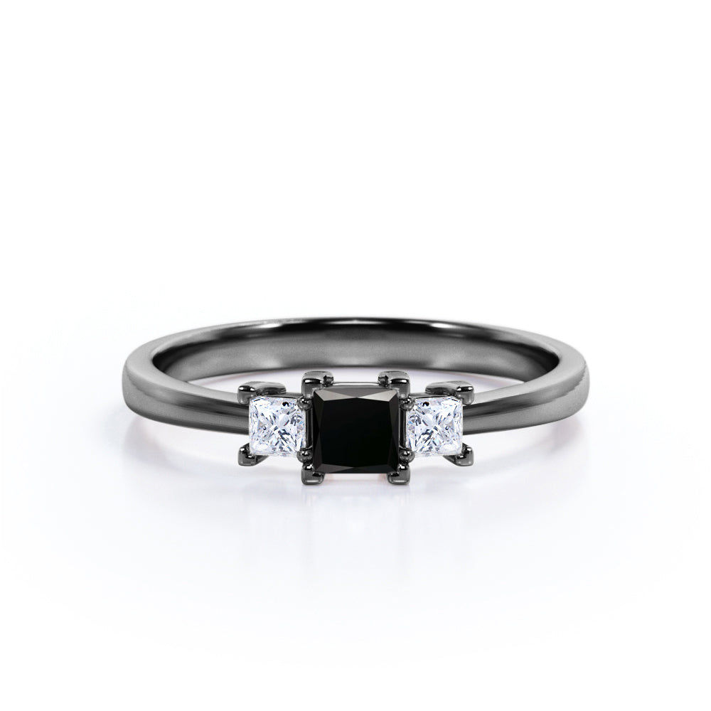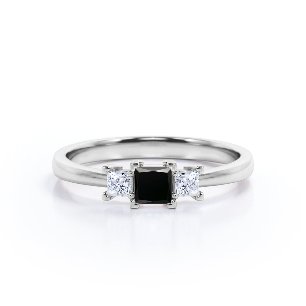1.15 carat princess cut Lab Grown Black Diamond three stone engagement ring in white gold. Celebrate your love with our elegant three stone Lab Grown Black Diamond engagement ring.This princess cut Lab Grown Black Diamond ring in white gold features 1 carat Lab Grown Black Diamond in the center and 0.15 carat of diamond side stones.This three stone engagement ring will be the perfect symbol of your love and will definitely make you stand out in the room full of people. This halo engagement ring is the best option to show your love and care to your loved ones. This minimalist Lab Grown Black Diamond ring can be customized to 10k Gold, 14k Gold depending upon your choice.