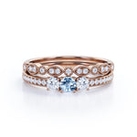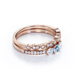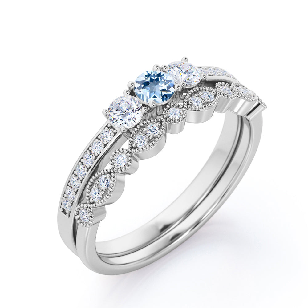 1.15 Carat Round Cut Aquamarine And Diamond Leaf Art Deco Wedding Ring Set In White Gold