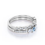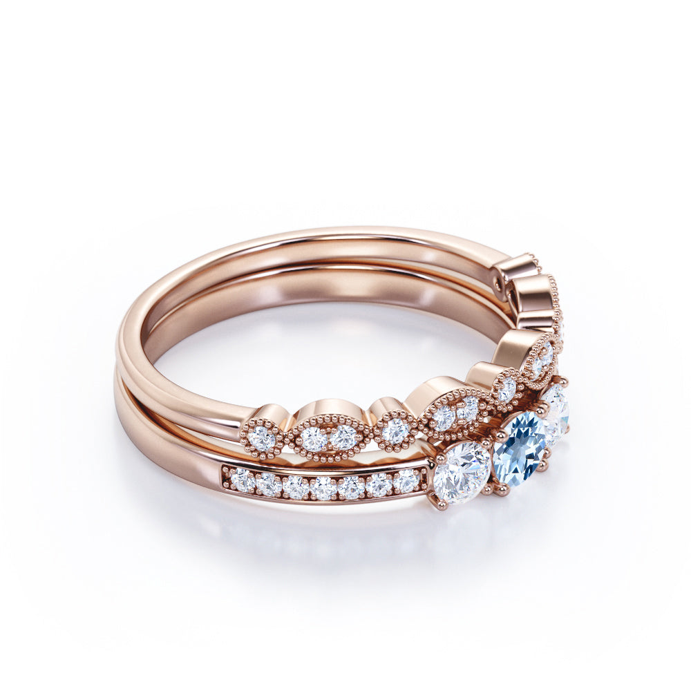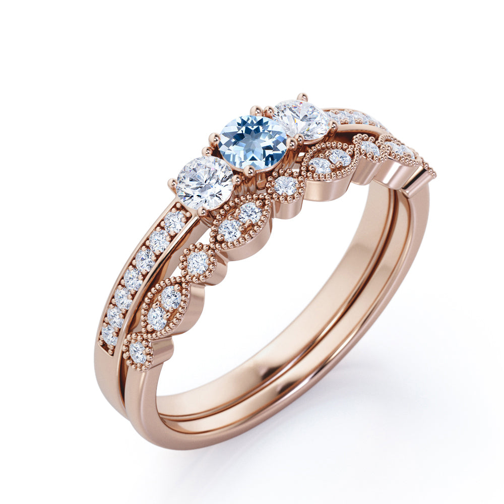 1.15 Carat Round Cut Aquamarine And Diamond Leaf Art Deco Wedding Ring Set In White Gold. Be madly in love with this lovely nature-inspired wedding ring set. The engagement ring highlights a very fine blue aquamarine center stone that is prong-set together with the diamond side stones on each side of the center stone with paved diamond side stones in the ring band that adorably sparkles even when viewed from afar. The matching band features a very classic leaf art deco design with intricate milgrain details carefully handcrafted by our talented and experienced jewelers. Handcrafted with passion, this adorable bridal set features a 1 perfect blue round aquamarine center stone, surrounded by, 0.15 carat brilliantly sparkling diamond side stones for the gold rings and moissanite for the silver rings that weigh a total of 1.15 carat. Adorable in white gold, this wedding ring set is also available in rose gold, yellow gold, and black gold. Also, it can be made between 18k gold over silver, 10k gold, and 14k gold depending on your preferred customization. Please kindly note for the silver ring option that silver is a very sensitive metal, any chemicals like hand creams, lotion, or sanitizers. etc., can affect the plating.