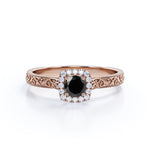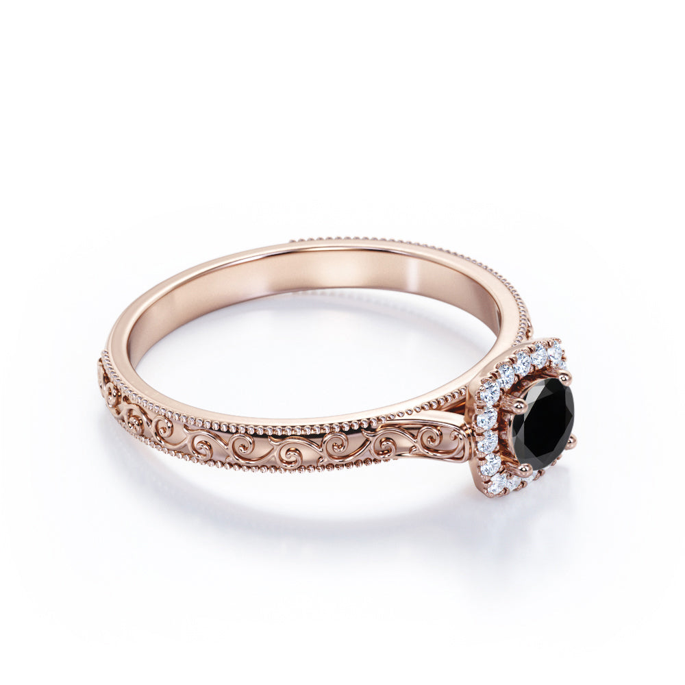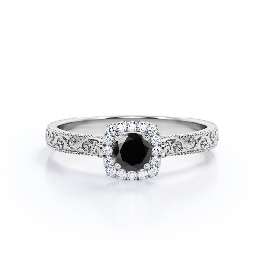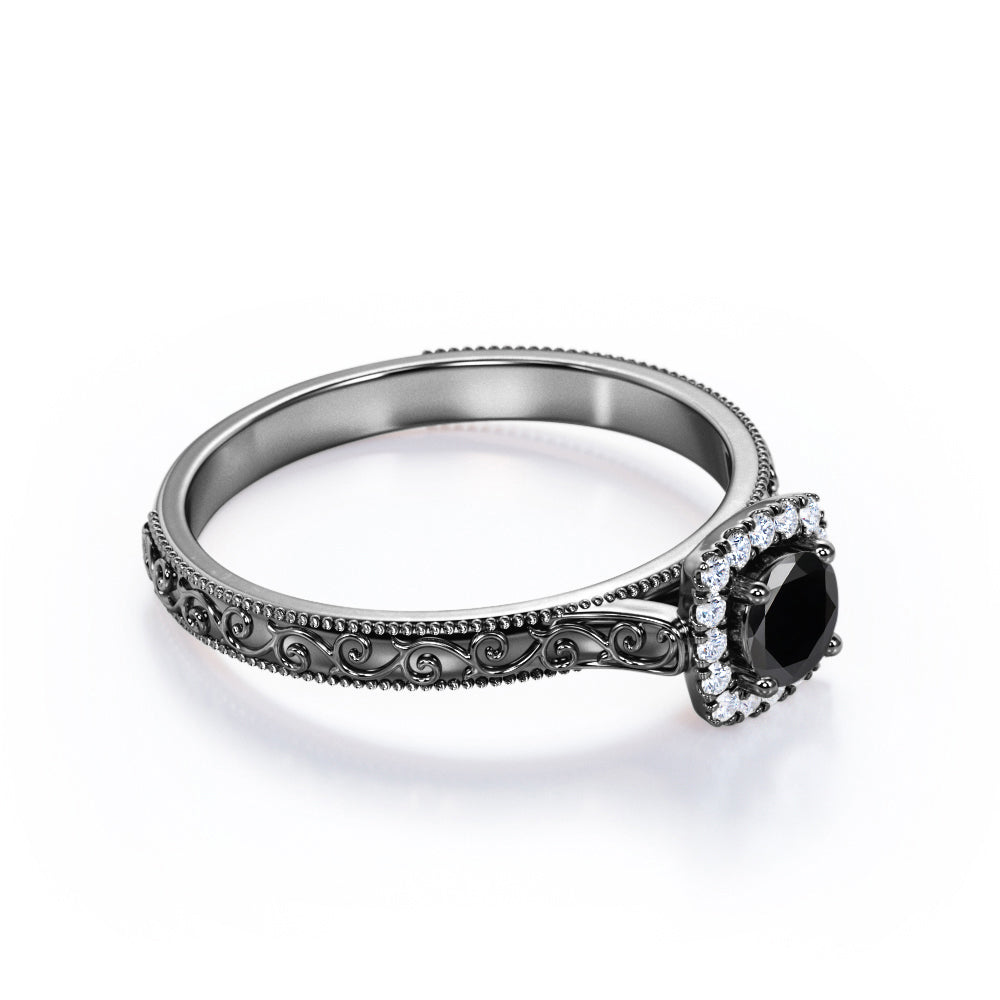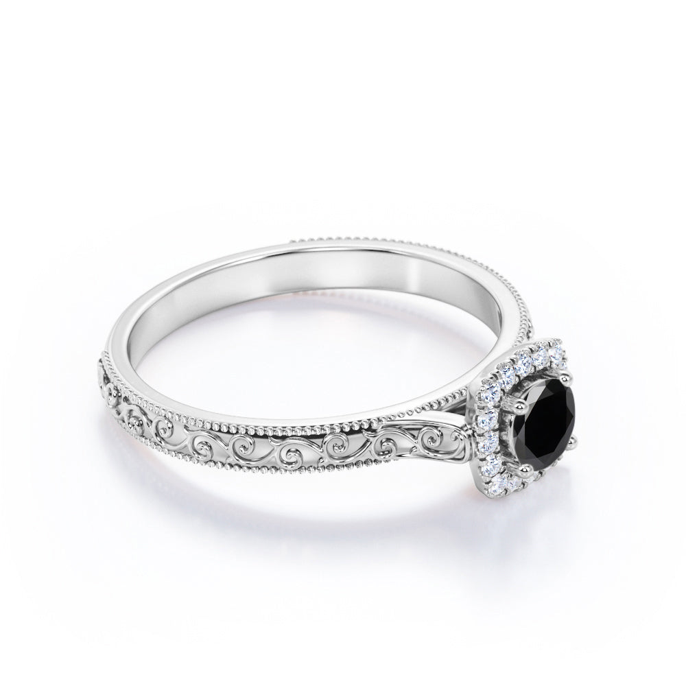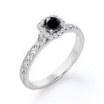 1.15 carat round cut Lab Grown Black Diamond art deco engagement ring in white gold. If you are searching for an engagement ring and you like vintage jewelry, this version of an antique milgrain Lab Grown Black Diamond ring may be just the one what you are looking for. Our craftsmen created this antique design in the style of Victorian and Art Deco periods of our past. This halo engagement ring features round cut Lab Grown Black Diamond of 1 carat and 0.15 carat of side diamonds. This antique engagement ring features fascinating art deco as well as detailed milgrain work at the edges which is extremely eye-pleasing. This 1.15 carat round cut Lab Grown Black Diamond art deco engagement ring in white gold can also be customized to 10k Gold, 14k Gold according to your preference.
