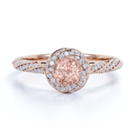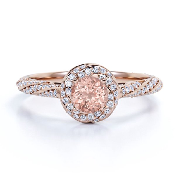 Paint your love story with this 1.2 TCW Round Cut Lab Created Morganite - Splendid Encrusted Twirl - Pave Halo Engagement Ring - 18K Rose Gold Plating over Silver. Skillfully hand-cut into a nice round cut by our experts in lapidary, this splendid morganite engagement ring features total 1.20 carat morganite and side moissanites on solid rose gold plating over silver. Special and non-traditional, this statement morganite ring is perfect for those who would love to express their charisma and uniqueness. With its charming color, this female morganite engagement ring will enhance happiness and attract positive vibes. This female morganite engagement ring is beautiful and accessible since it is available at an affordable price. For those who have no idea what to surprise your life partners, this female morganite engagement ring can be a good choice for any special occasion, i.e. a birthday ring, an engagement or marriage proposal ring, a Valentines' day ring, etc. Let’s impress her with this morganite promise ring and she will be eternally joyful.