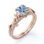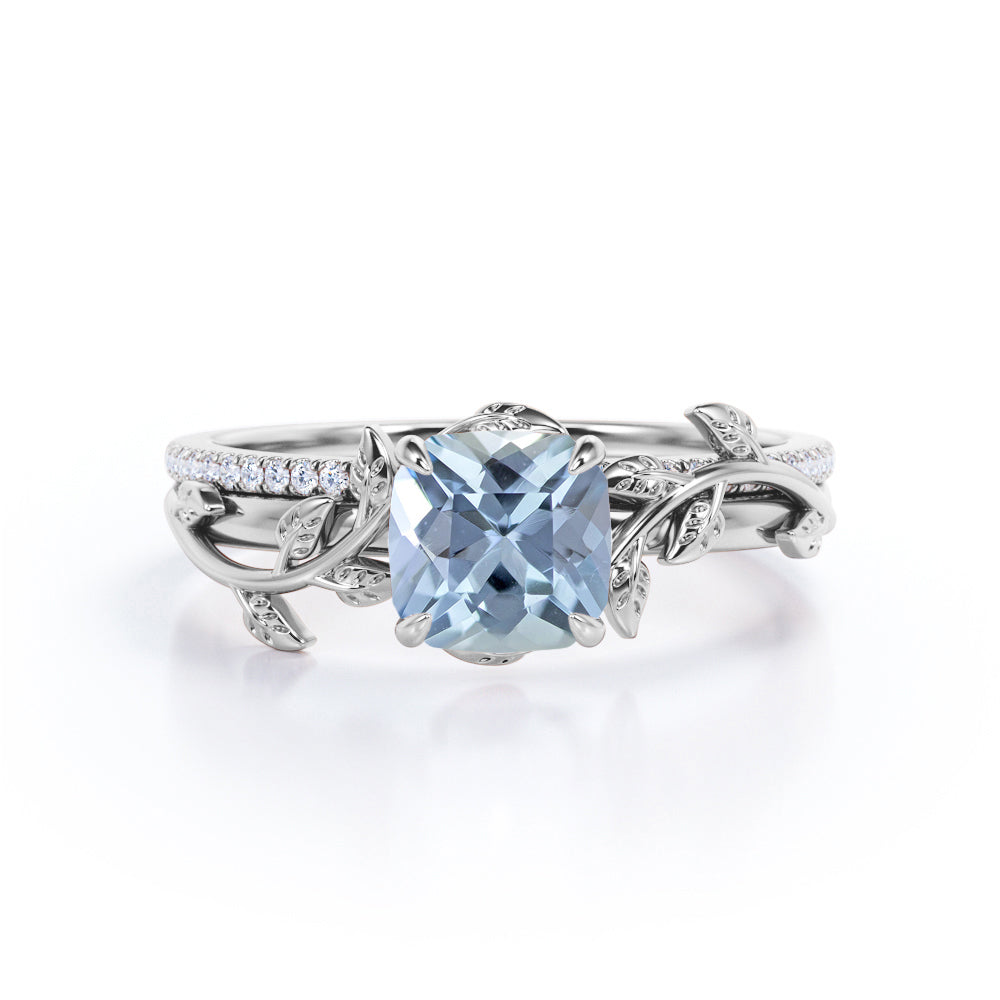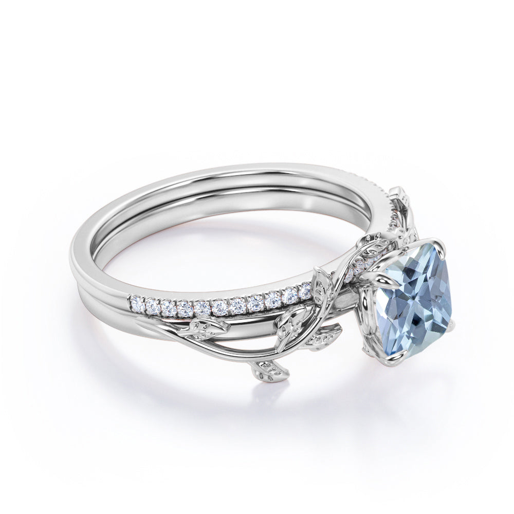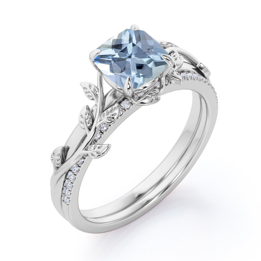 1.25 Carat Cushion Cut Aquamarine And Diamond Nature-Inspired Wedding Ring Set in White Gold. Her heart will absolutely flutter with this wonderful vintage bridal set. The solitaire engagement ring highlights a beautifully handcrafted leaf and vine design perfectly detailed by our talented and experienced jewelers. A matching wedding band is paved with dazzling diamonds that sparkle when viewed from any angle. Handcrafted with passion, this antique wedding ring set features a 1 carat very fine cushion-cut aquamarine center stone, with 0.25 carat sparkling diamonds in the band for the gold rings and moissanite for the silver rings. Gorgeous in white gold, this timeless bridal set is also available in rose gold, yellow gold, and black gold. Also, it can be made between 18k gold over silver, 10k gold, and 14k gold depending on your preferred customization. Please kindly note for the silver ring option that silver is a very sensitive metal, any chemicals like hand creams, lotion, sanitizers. etc., can affect the plating.