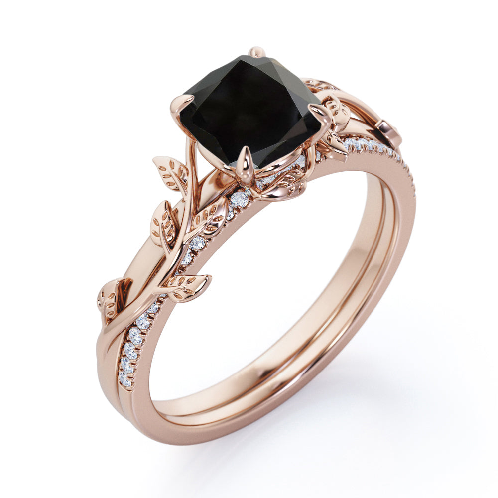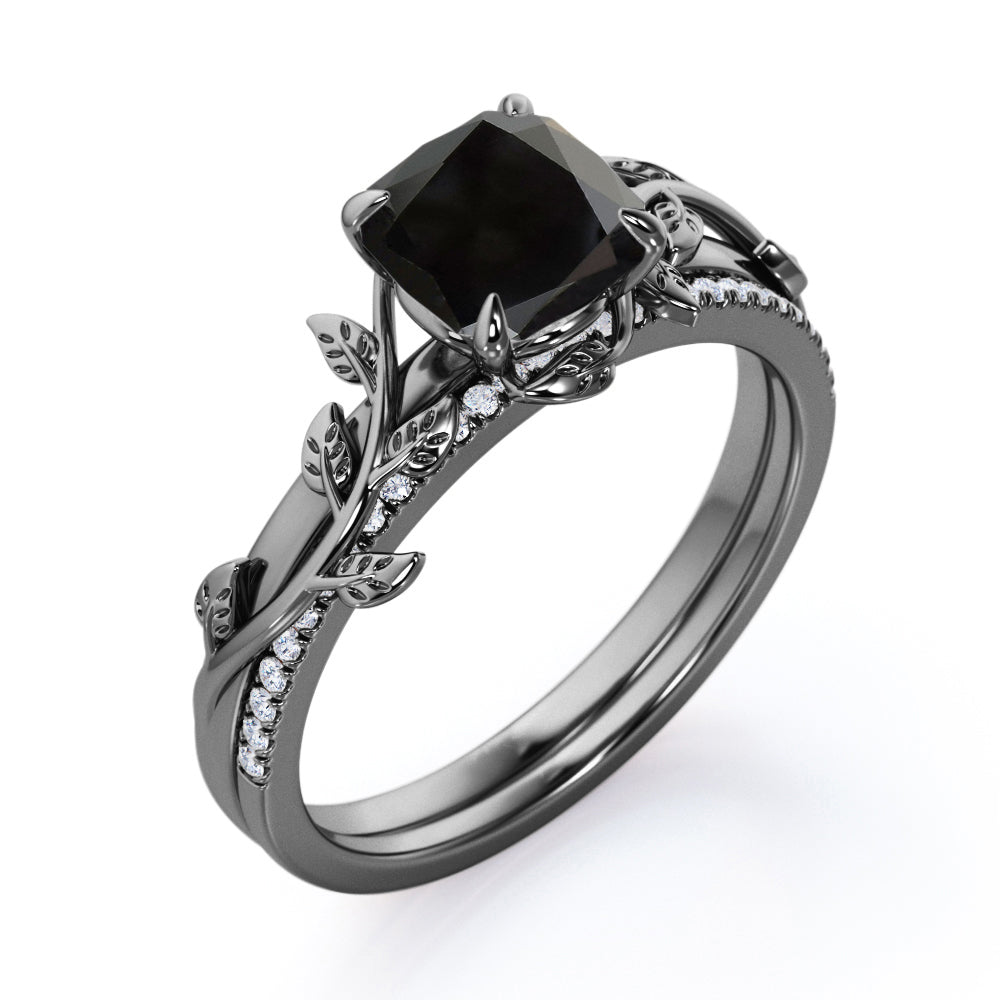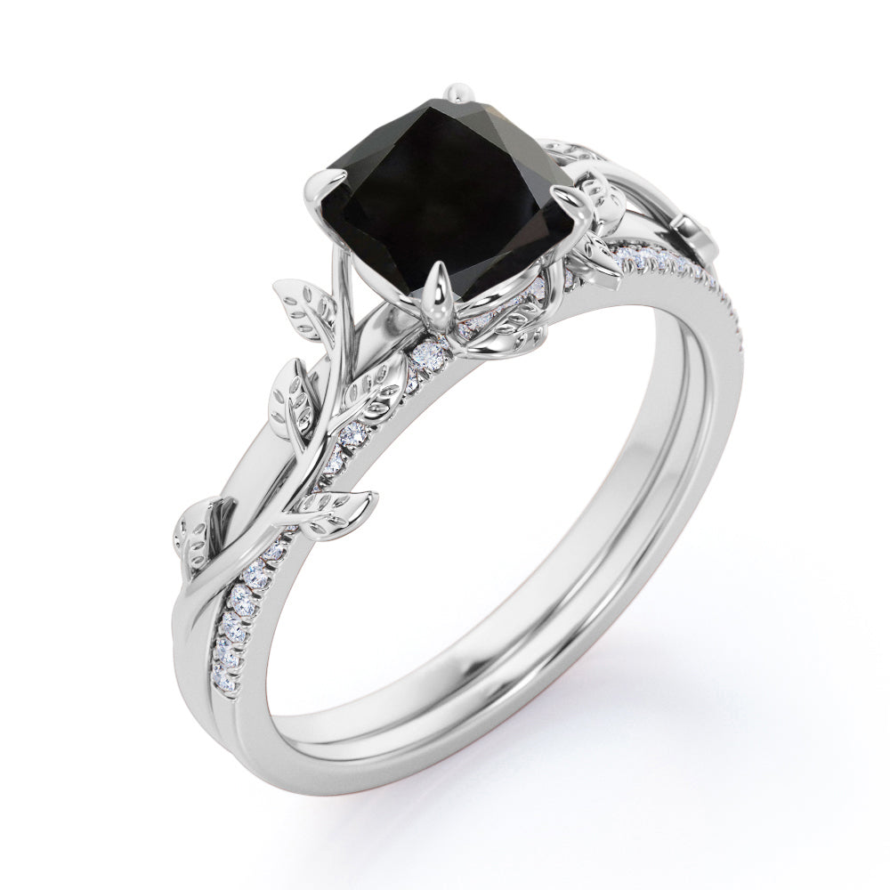 1.25 carat cushion cut Black Diamond nature inspired wedding ring set in white gold. Love how it looks? You are going to love how it feels on your beautiful fingers. Our Black Diamond nature inspired wedding ring set is an eye-catching piece. This leaf style ring in cushion cut is made in real white gold.. This fascinating wedding set comprises of 1 carat solitaire engagement ring and 0.25 carat of matching wedding band which will go perfectly with any of your ensemble. Begin the new chapter of your life with our vintage nature inspired wedding set to keep all the wonderful memories alive in your fingers that you will cherish forever. This 1.25 carat cushion cut Black Diamond nature inspired wedding ring set in white gold can also be customized to 10k Gold, 14k Gold.