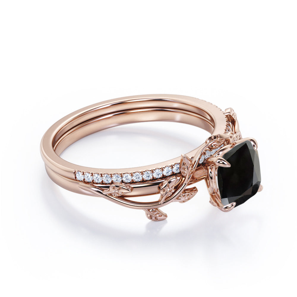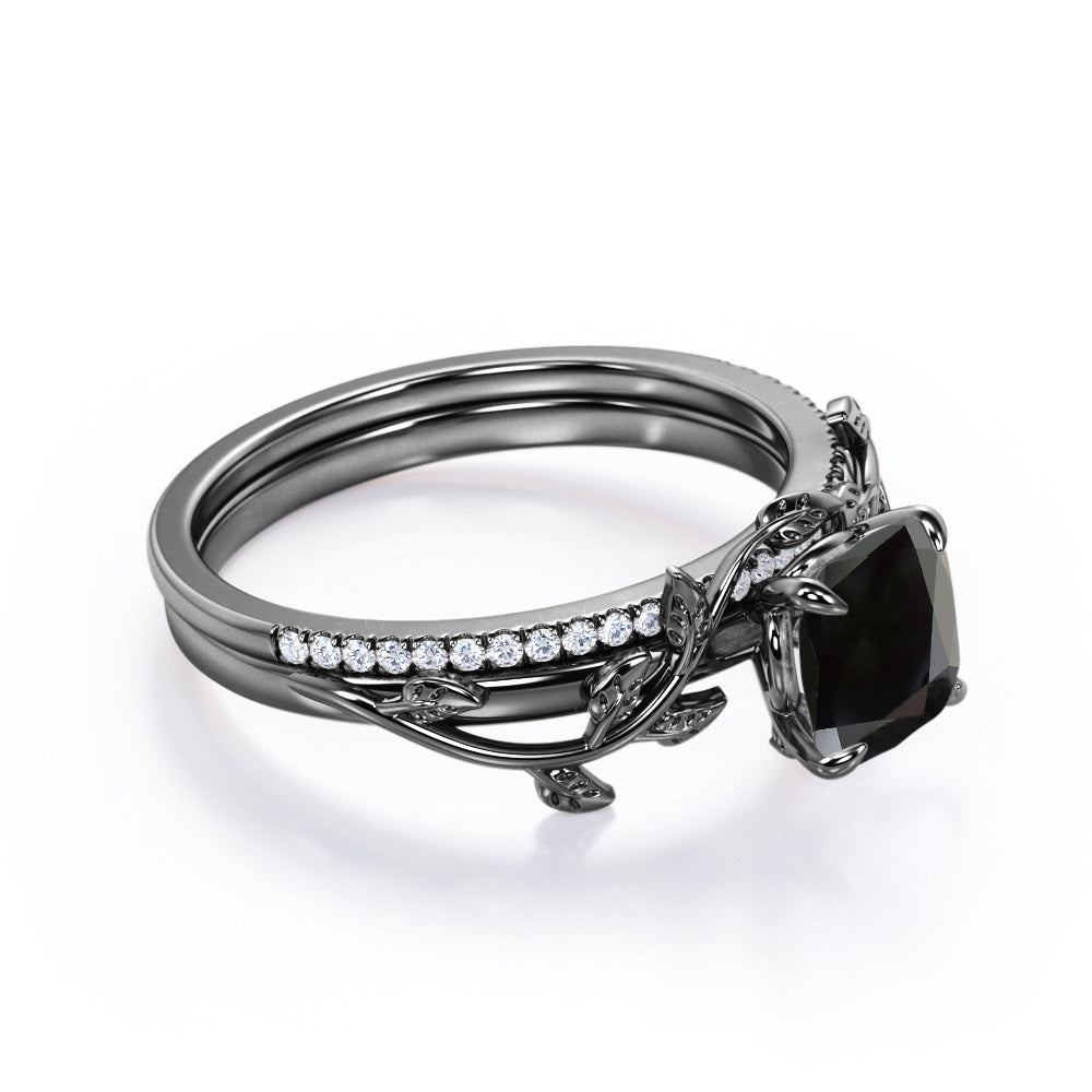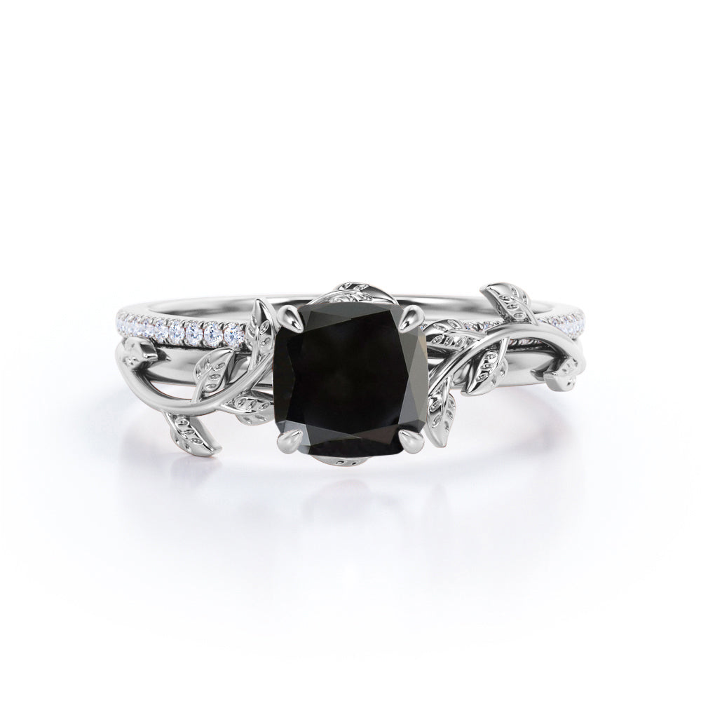 1.25 carat cushion cut Black Diamond nature inspired wedding ring set in white gold