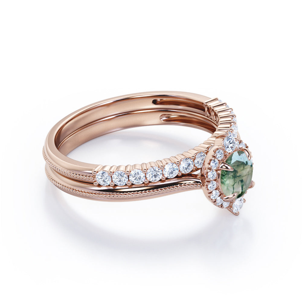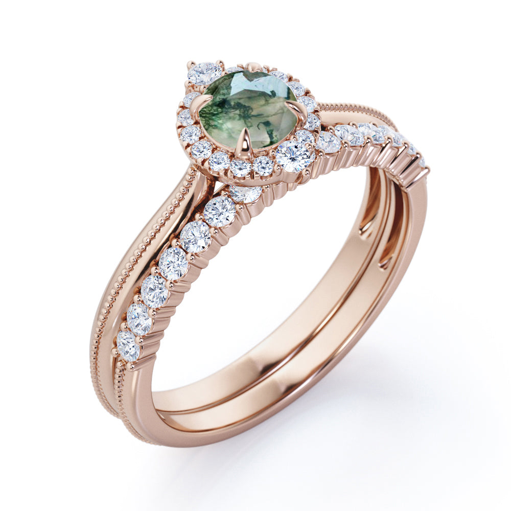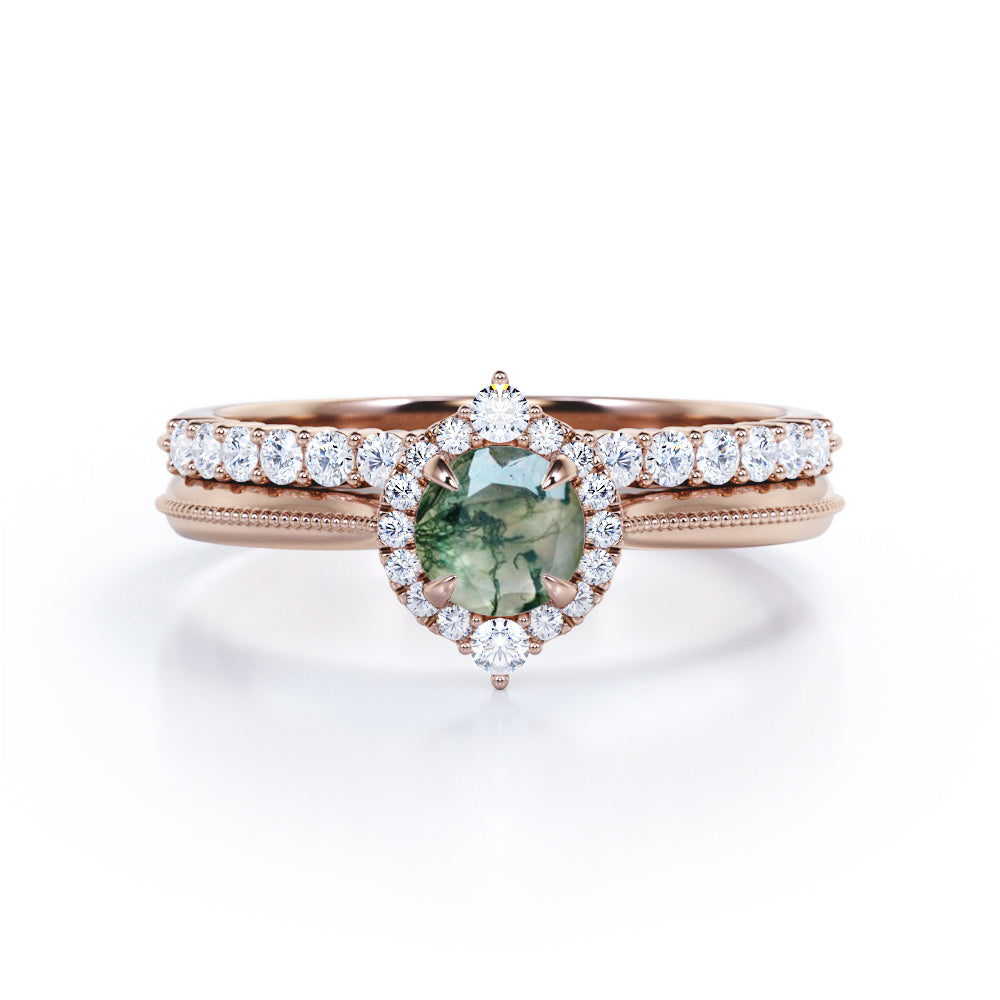 1.25 Carat Round Moss Agate Milgrain Wedding Ring Set