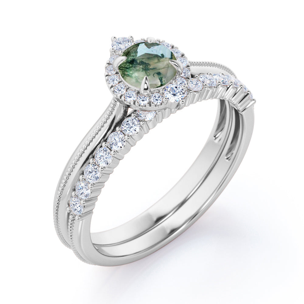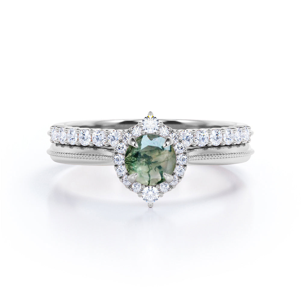 Victorian-inspired. 1.25 carat Natural Round Moss Agate and Moissanite Milgrain Wedding Set in White Gold. This bridal ring set offers you 2 different rings. The engagement ring boasts a 0.5 carat round Moss agate and surrounded by paved Moissanite halo. The stones on top and bottom of the accent have a larger size which increases the sparkle of the accent. The band of the promise ring is decorated with lined Milgrain beads, making it more fashionable. The stackable wedding band that comes in the set features dainty round Moissanite that are perfectly placed in shared prongs by half of the band while the rest of the band also adorns Milgrain decoration as same as the promise ring. This affordable wedding set can be customized to your choice of 18k gold over silver, 10k gold, 14k gold and 18k gold with the color of white gold, rose gold, yellow gold and black gold.