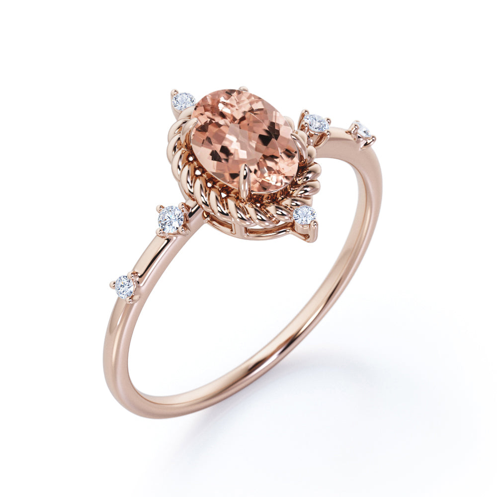 This is a very beautiful handmade art deco style Morganite and Diamond Engagement Ring for women. The ring is made with real peach pink morganite, real diamonds and on real gold. The handcrafted engagement ring features 1 carat oval cut peach pink morganite in the center, surrounded with 0.25 carat of diamonds, for a total carat weight of 1.25 Carats.