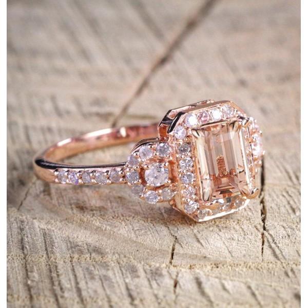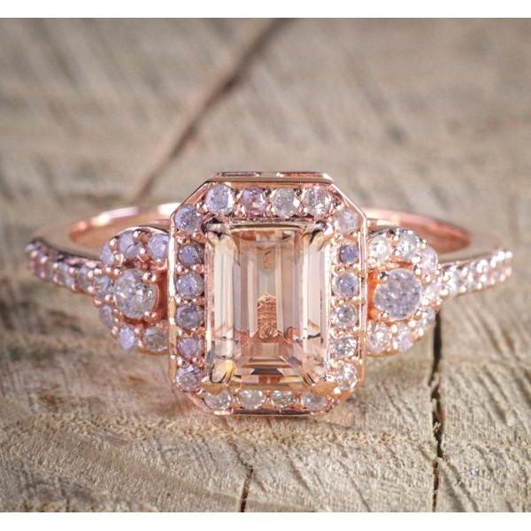 1.25 Carat Peach Pink Morganite (emerald cut Morganite) and Diamond Engagement Ring in 10k Rose Gold